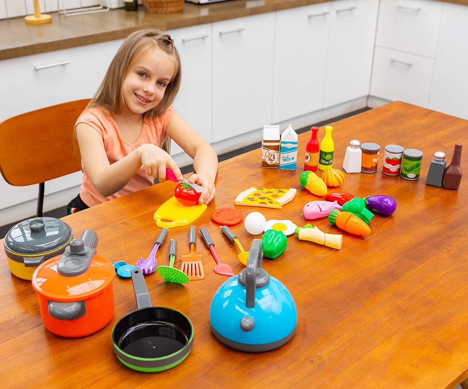 Реалистичная пластиковая еда и кухонные наборы включают в себя различные продукты, которые можно нарезать, бутылки соевого соуса, оливковое масло и кетчуп, банки с томатным соусом, зеленая фасоль, разноцветные кастрюли и сковородки с кухонной утварью. С нашим кухонным набором дети могут готовить вместе с вами, развивать мелкую моторику, демонстрировать свои творческие способности и стимулировать свое воображение!