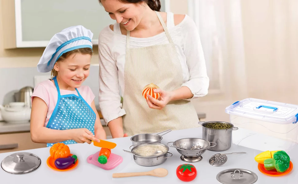 Внимание всем юным шеф поварам, кто искренне мечтал о своей кухне и любит играть в готовку! Этот кухонный набор объединил в себе всё самое необходимое для этого: униформу, 3 кастрюли и сковородки из нержавеющей стали, 2 тарелки, нож, разделочную доску, деревянную ложку, набор лопаток из нержавеющей стали, а также 7 овощей, которые действительно можно разрезать! Ну а позже хранить все эти принадлежности можно в большом прозрачном ящике с крышкой! Такие игры развивают у детей любовь к кулинарии, аккуратность, воображение, а также, несомненно, дарят много позитива и интересных моментов! Ведь, признайтесь, каждый из нас хотел в детстве приготовить что-нибудь вкусное!