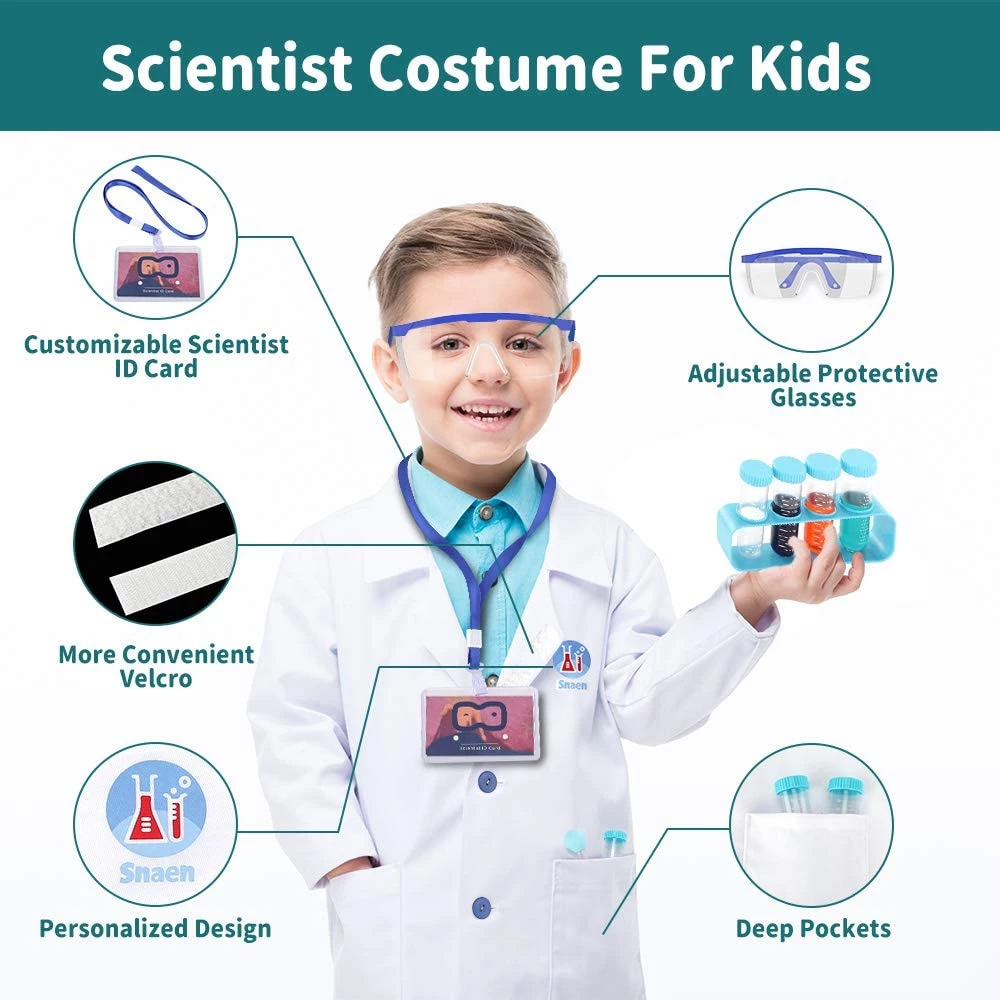Ученые надевают лабораторные халаты, когда проводят эксперименты! В набор включен белый лабораторный халат, подходящий для детей в возрасте от 3 до 8 лет. Есть также защитные очки и бейдж ученого, которые сделают игру круче! Все химические материалы прошли проверку на безопасность, чтобы гарантировать безопасность детей. А инструменты для научных экспериментов изготовлены из безопасного и прочного материала ABS, а не из стекла, не беспокойтесь о том, что ребенок сломает инструмент