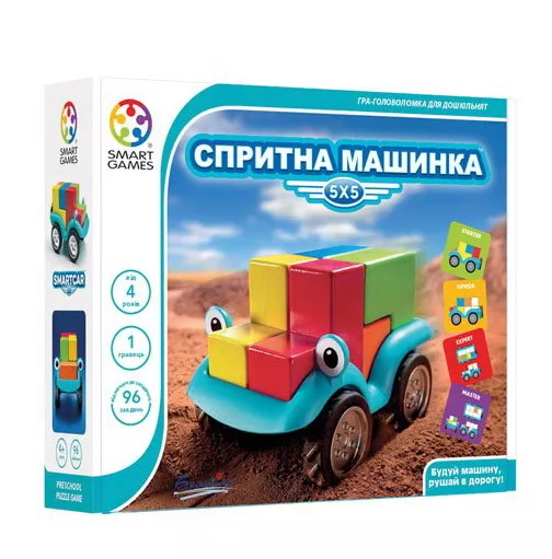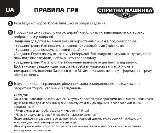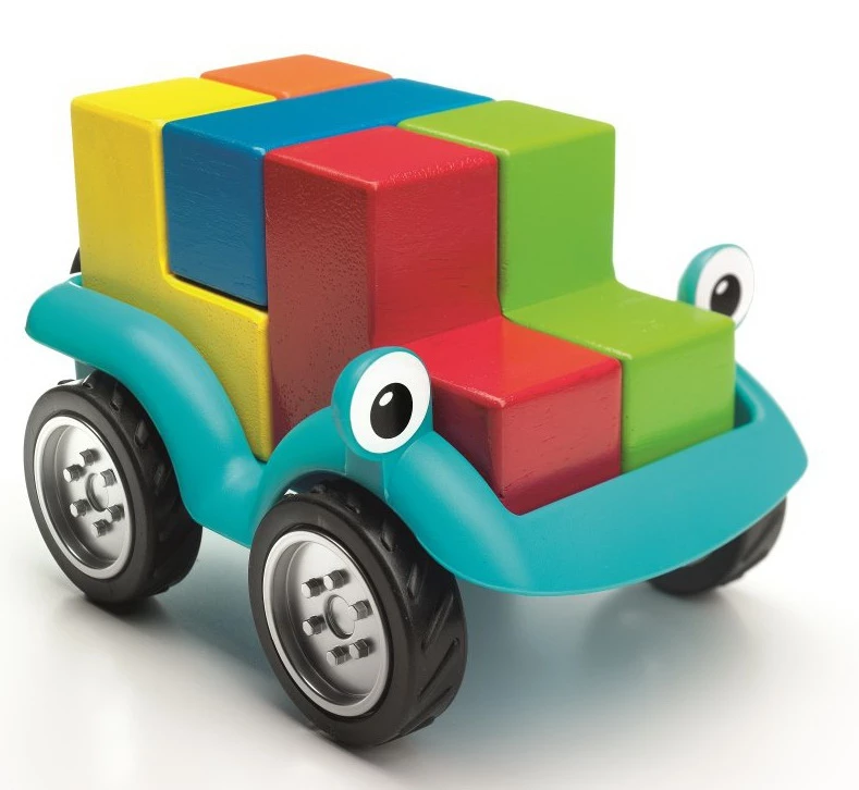 С этим набором можно не только развивать логику, но и играть с машинкой. Сначала ребенок должен построить машинку из цветных блоков. В наборе есть пластиковое шасси-основа и 5 деревянных разноцветных блоков. В буклете 96 задач разного уровня сложности. После того как найдено решение логической задачи, можно поиграть в гонки.