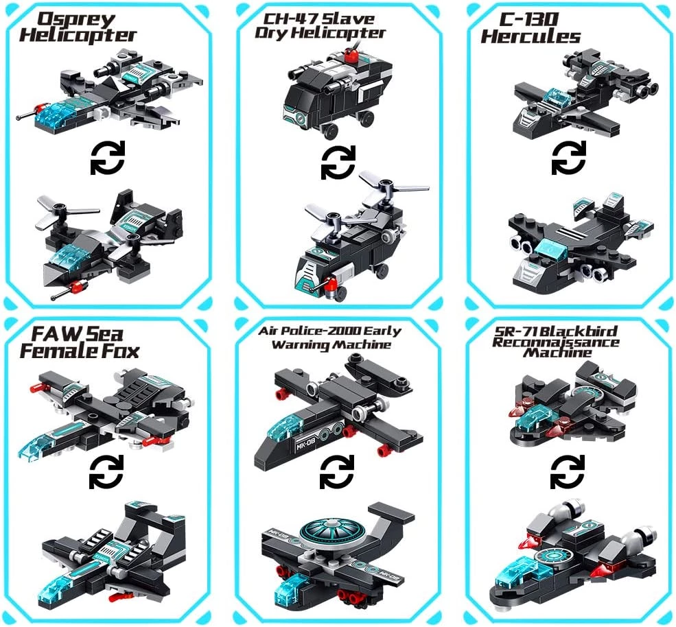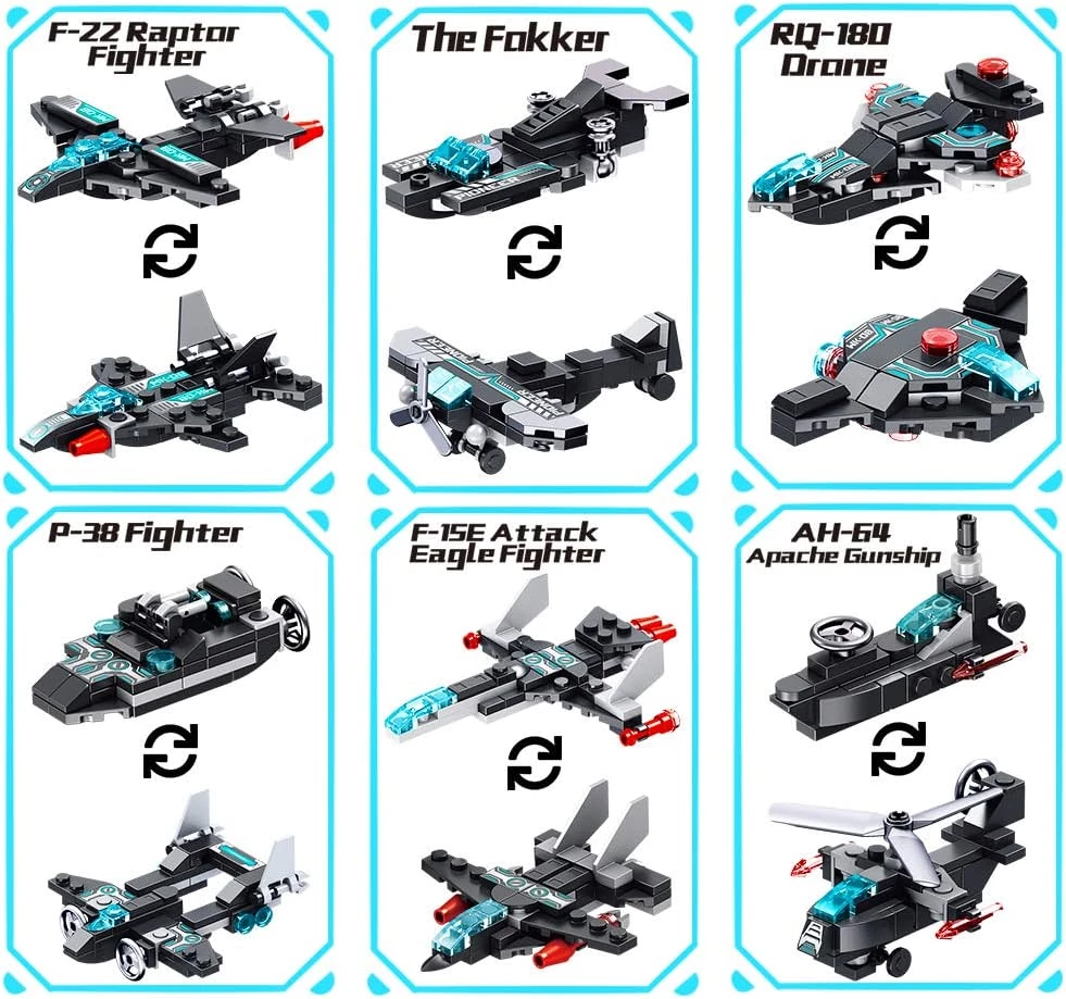 Развивающий набор поможет улучшить зрительное-моторную координацию и манипулятивные способности ребенка, а также потренировать его логическое мышление и способность самостоятельно решать поставленные задачи. Конструктор познакомит ребенка с военной техникой: при помощи деталей, входящих в набор, можно собрать 12 самолетов и истребителей, каждый из которых имеет 2 модификации. Ребенок сможет детально изучить конструкцию летательных аппаратов при ближайшем рассмотрении. Всего можно собрать 25 моделей (24 самолета или истребителя и одного робота-трансформера).