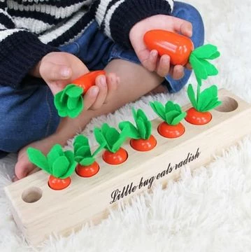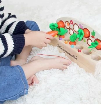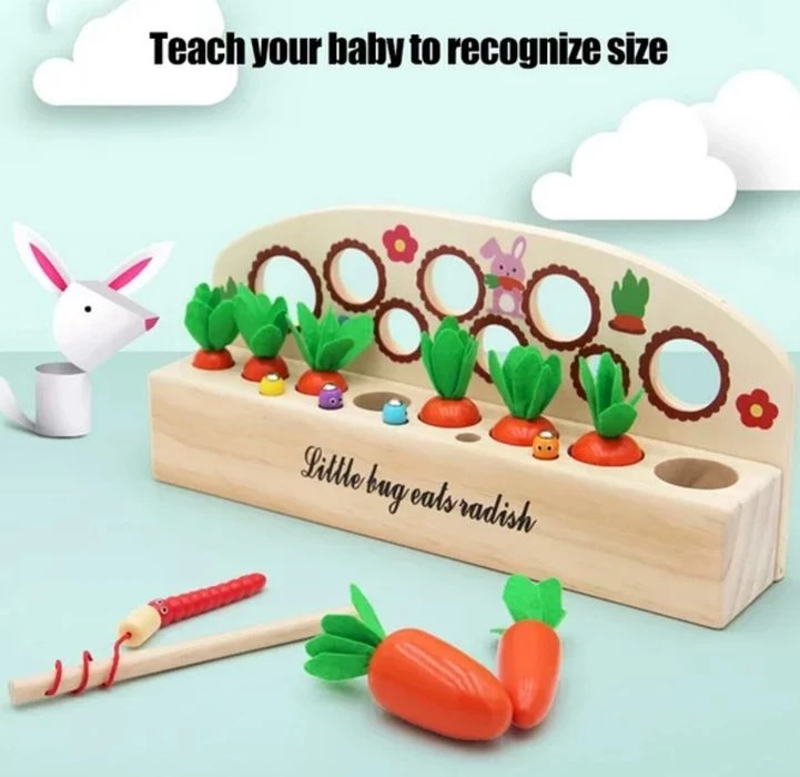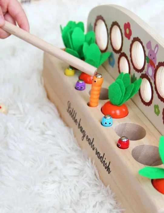 Деревянный сортер предназначен для развития у детей мелкой моторики рук, координации движений и концентрации внимания. В основе есть отверстия, в которые необходимо вставлять морковку и червяков. Это делается с помощью удочки с магнитной вставкой. Ребенку придется постараться, чтобы словить предмет и затем определенные умения, чтобы поместить его в ячейку. Набор может стать приятным подарком на любой праздник.