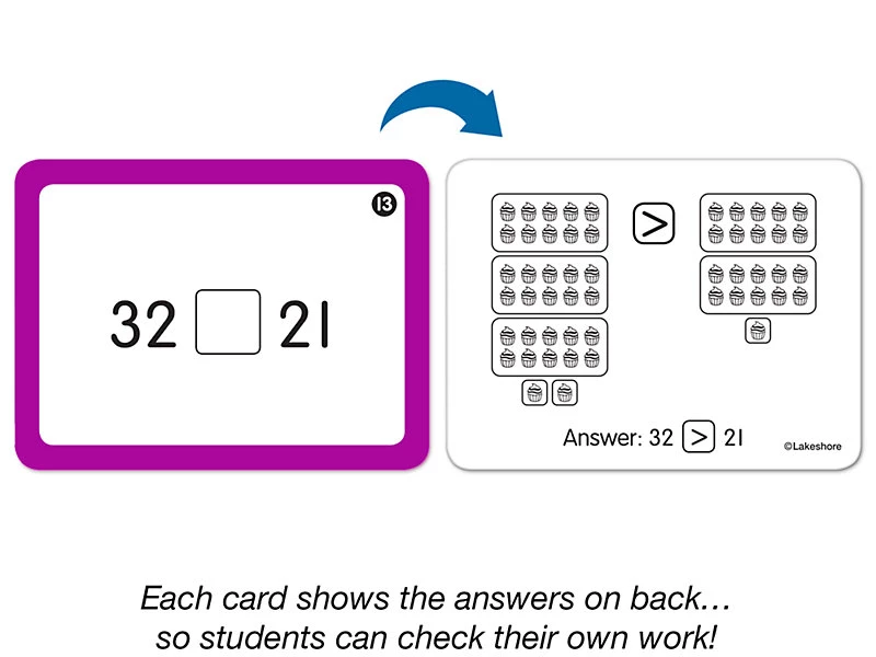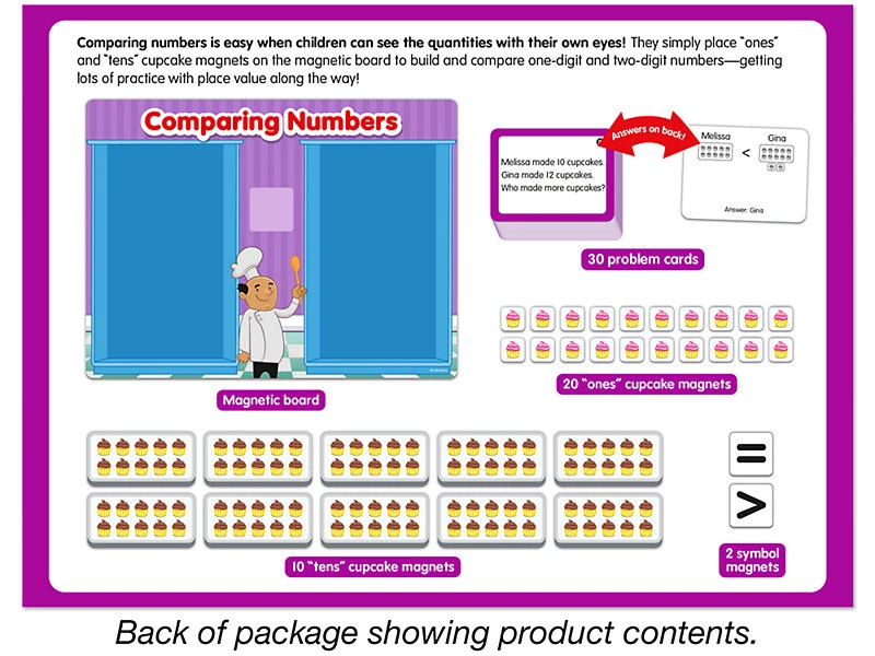Эта математическая доска помогает детям развивать необходимые навыки в сравнении и изучении чисел! Дети просто выбирают карточку с заданием, и кладут магниты кекса в группы «десятки» и «единицы» на доске, чтобы визуализировать количества.