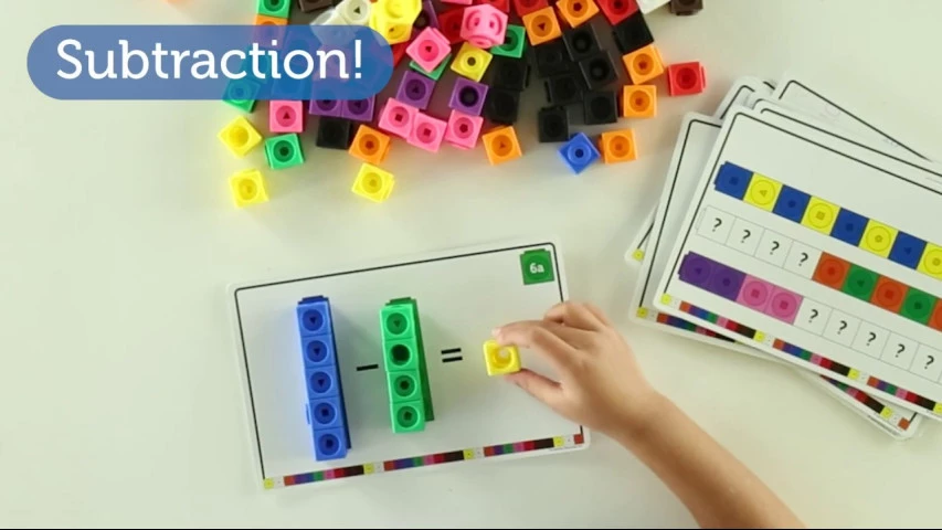 Разноцветные математические кубики лего и карточки с заданиями - помогут в игровой форме понять основы математики.