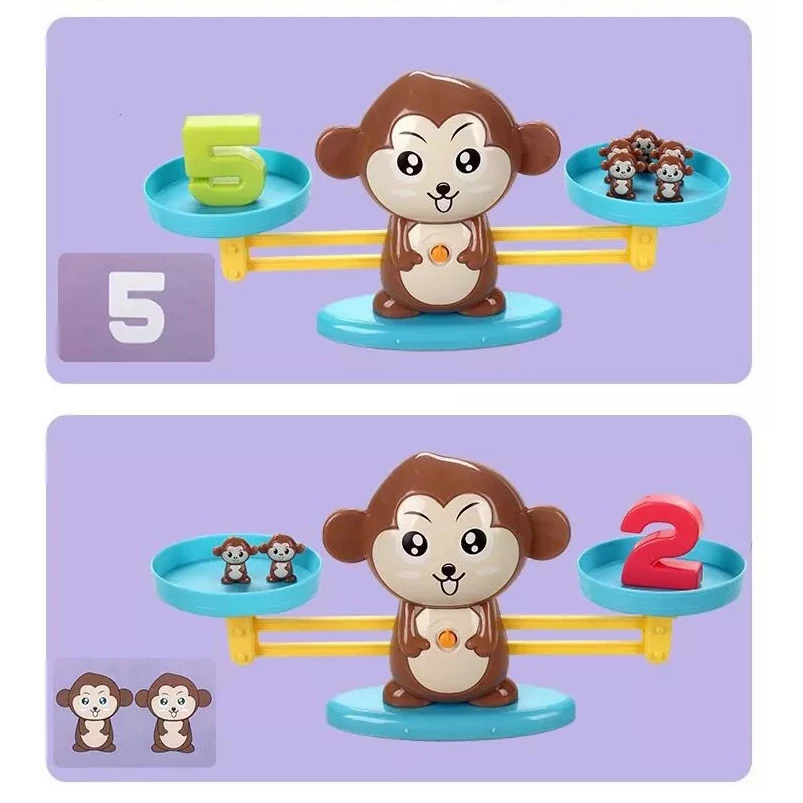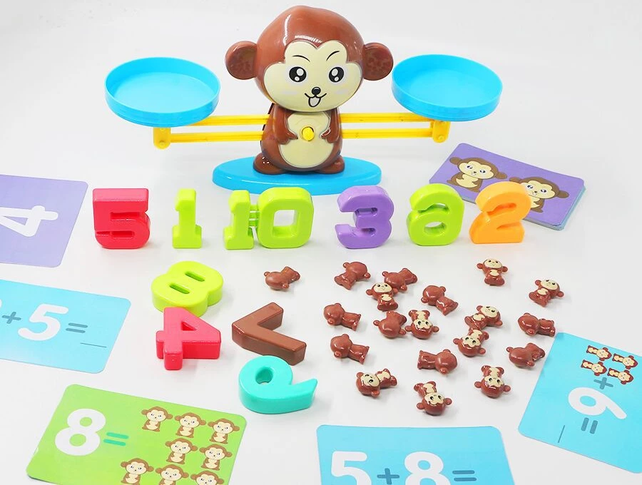 Этот забавный игровой набор поможет вашему ребенку научиться считать. Получайте базовые знания по математике, играя. В процессе игры ребенок узнает про такие понятия как счет, баланс и равновесия. Основа игрушки представляет собой весы, выполненные в виде обезьянки. Также в набор входят цифры от 1 до 10 и 19 обезьянок (эти предметы служат гирями для весов). Кроме того, в комплекте вы найдете 30 двусторонних карточек с заданиями трех уровней сложности. Цифры, входящие в набор имеют разный вес, каждая единица соответствует весу одной обезьянки. Например, цифра 4 равна весу четырех зверушек.