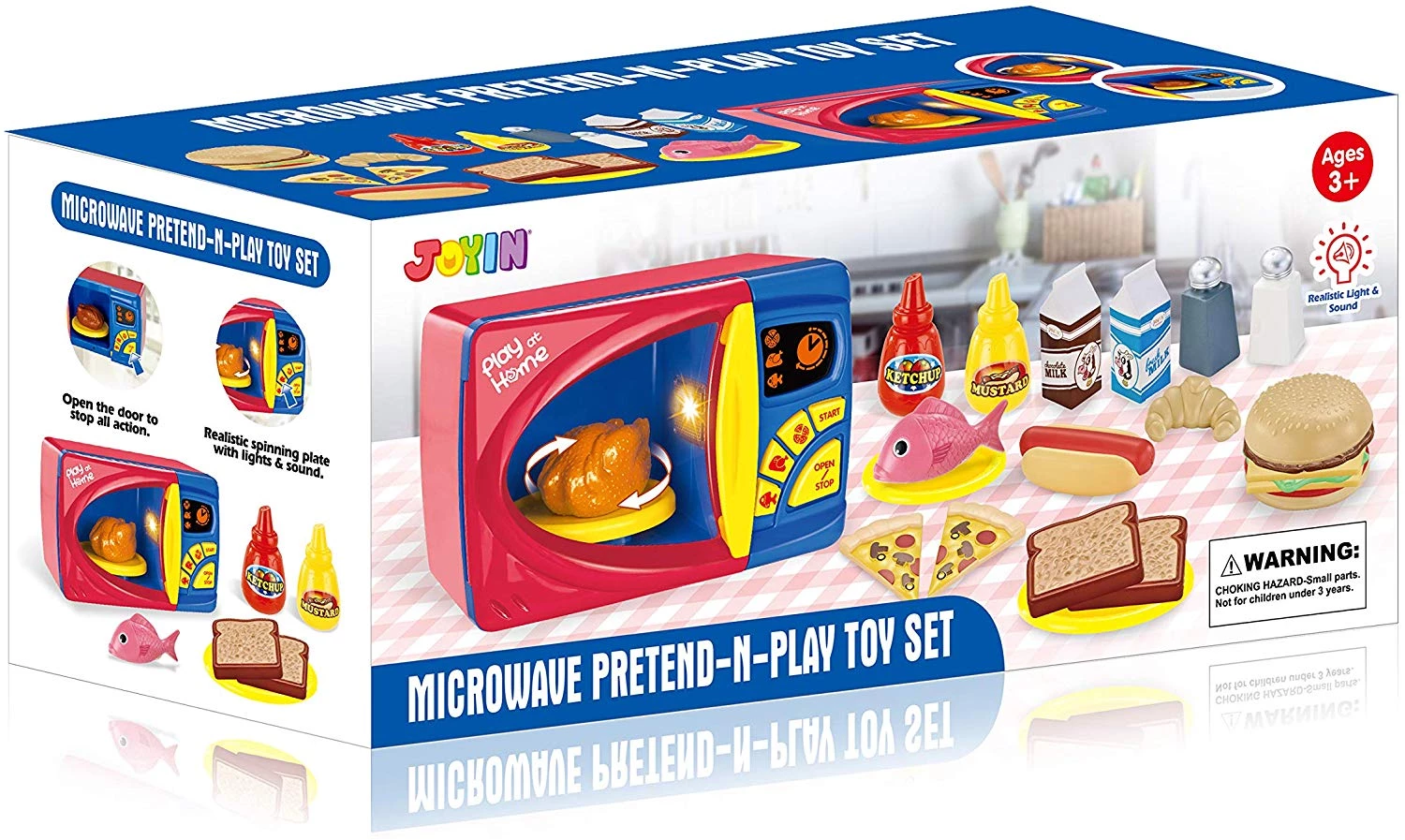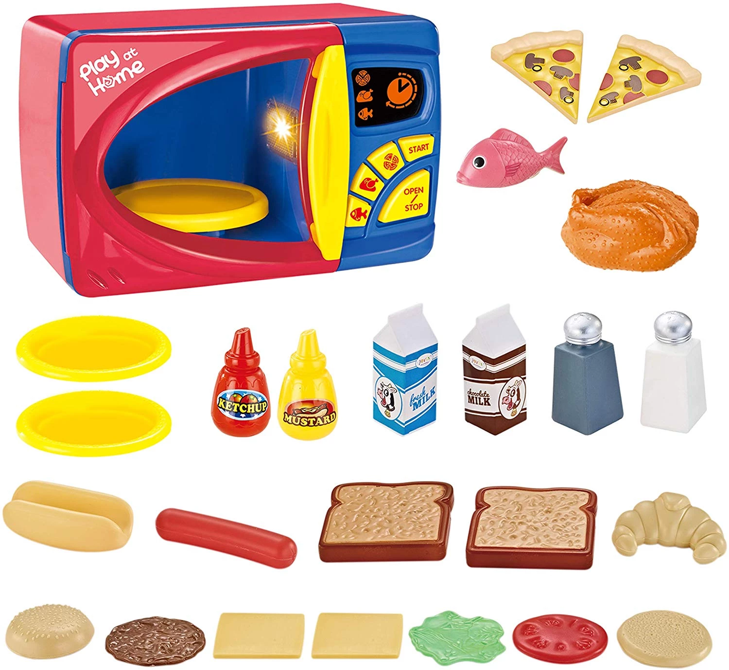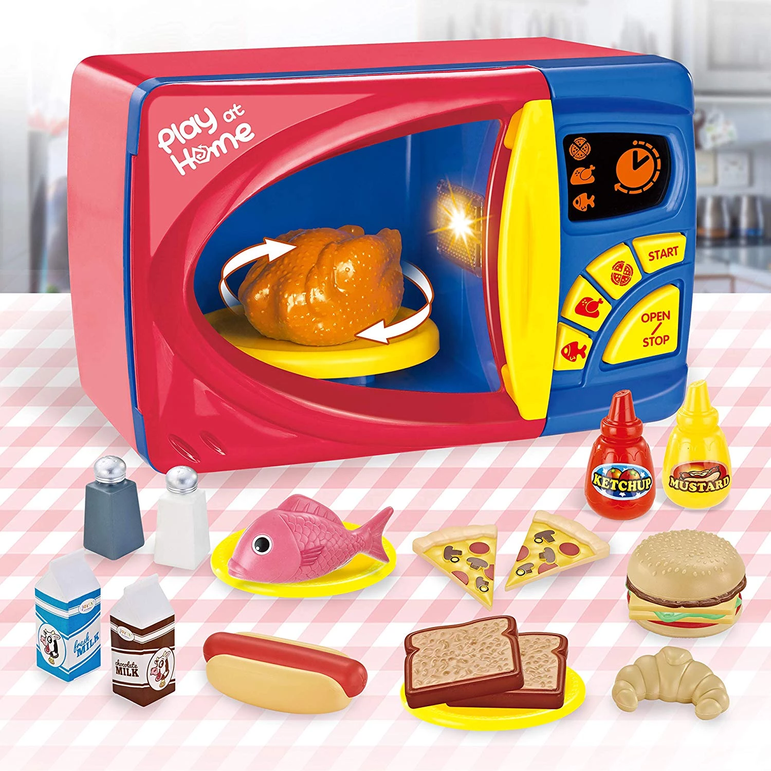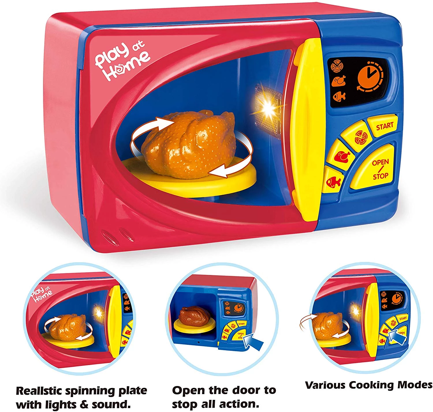 Реалистичный набор включает в себя многофункциональную вращающуюся электронную микроволновую печь с дисплеем и подсветкой, в которой можно "готовить" еду, например, хот-доги, гамбургеры, тосты и другие блюда. С этим набором, маленькие повара могут готовить вместе с вами, улучшать мелкую моторику, демонстрировать свои творческие способности и стимулировать свое воображение!