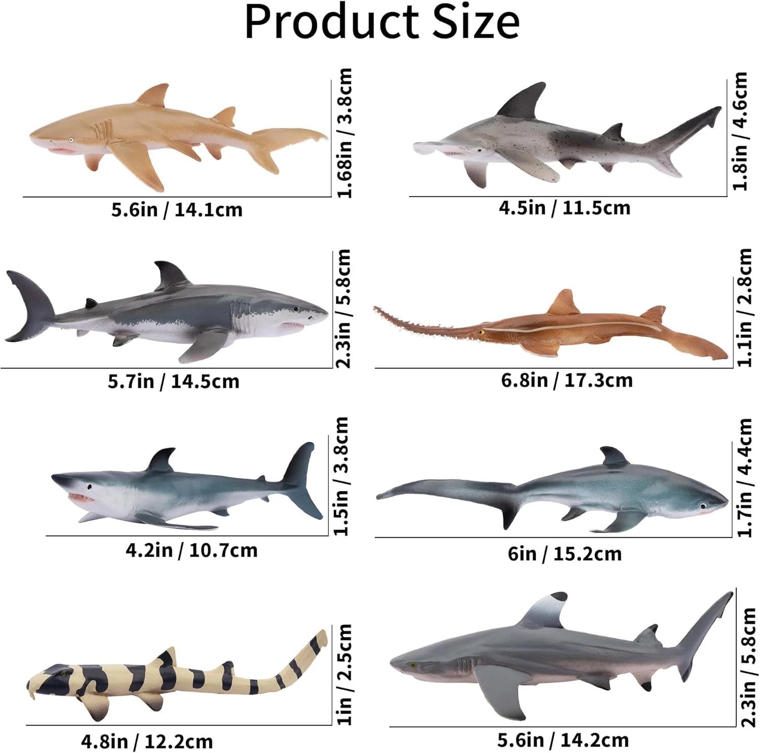 Данный набор состоит из восьми акул различных видов: белая акула, китовая акула, бамбуковая акула с белыми пятнами, леопардовая акула, акула-молот, короткопёрая акула-мако и две тигровые акулы. Он может стать прекрасным подарком для юных любителей морских хищников. Фигурки выполнены из качественного долговечного пластика и отличаются реалистичностью прорисовки. Их можно использовать для украшения аквариума, торта, в качестве сувениров или для различных игр в ванной.