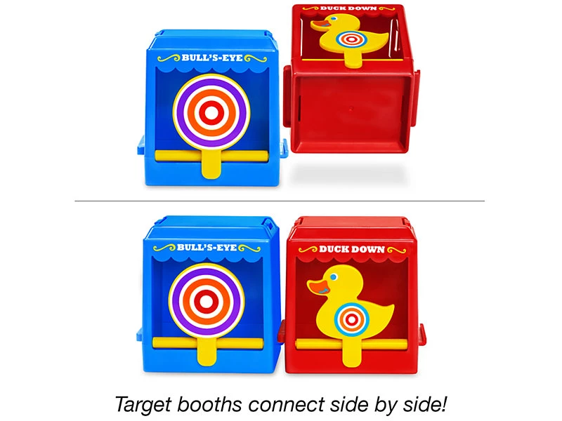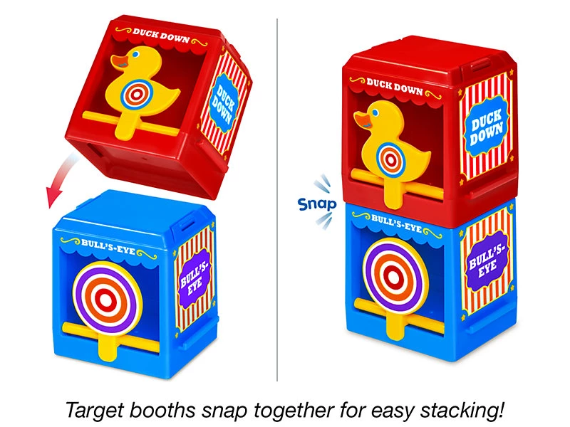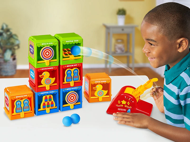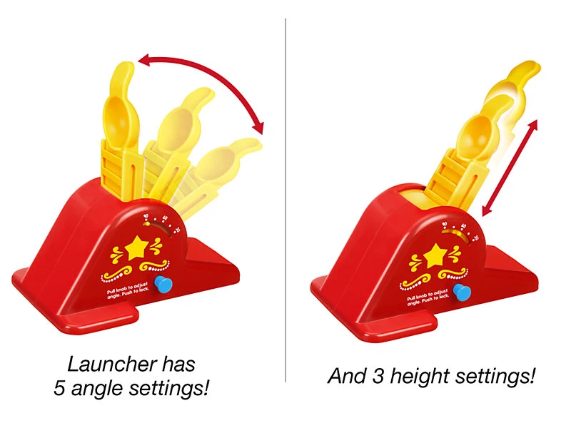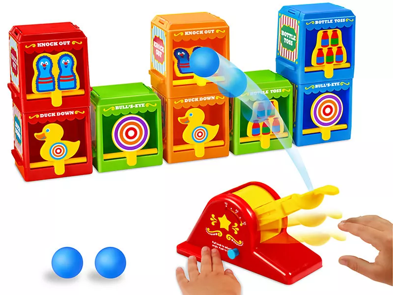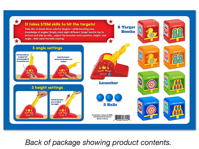 Эта веселая игра включает в себя регулируемую катапульту с 5-ю настройками угла пуска и 3-мя настройками высоты. 8 мишеней можно соединять множеством разных способов, получая каждый раз новый вариант игры. В наборе есть 3 шарика, которые можно метать из катапульты по мишеням. Есть игровой буклет, который помогает детям правильно определить углы, радиус и расстояние полета шарика.