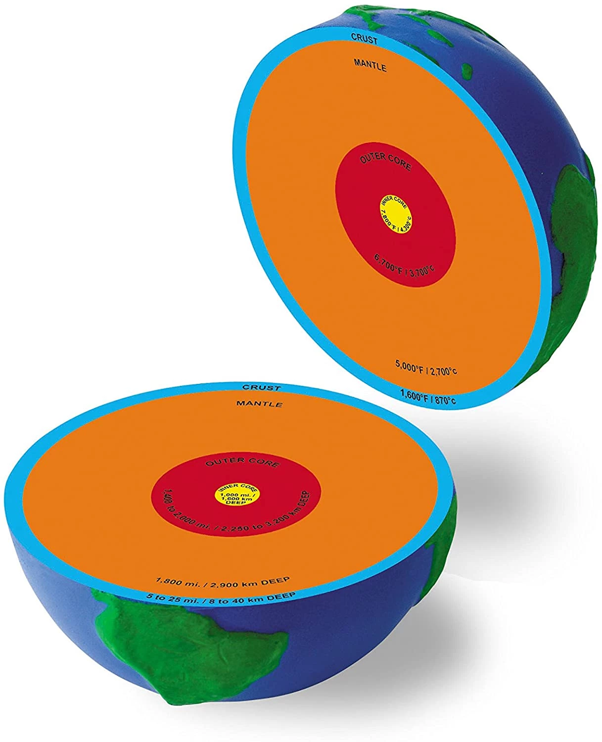 Учебная модель Земли предназначена для наглядного объяснения, что же находится внутри нашей планеты. Сфера разделена на две части, что помогает рассмотреть в разрезе кору, мантию, внешнее и внутреннее ядро. На полушария нанесены данные о температурах на том или ином уровне. Внешняя поверхность демонстрирует континенты и Мировой океан. Это прекрасный наглядный материал для усвоения знаний, может использоваться как в домашнем, так и в школьном обучении.