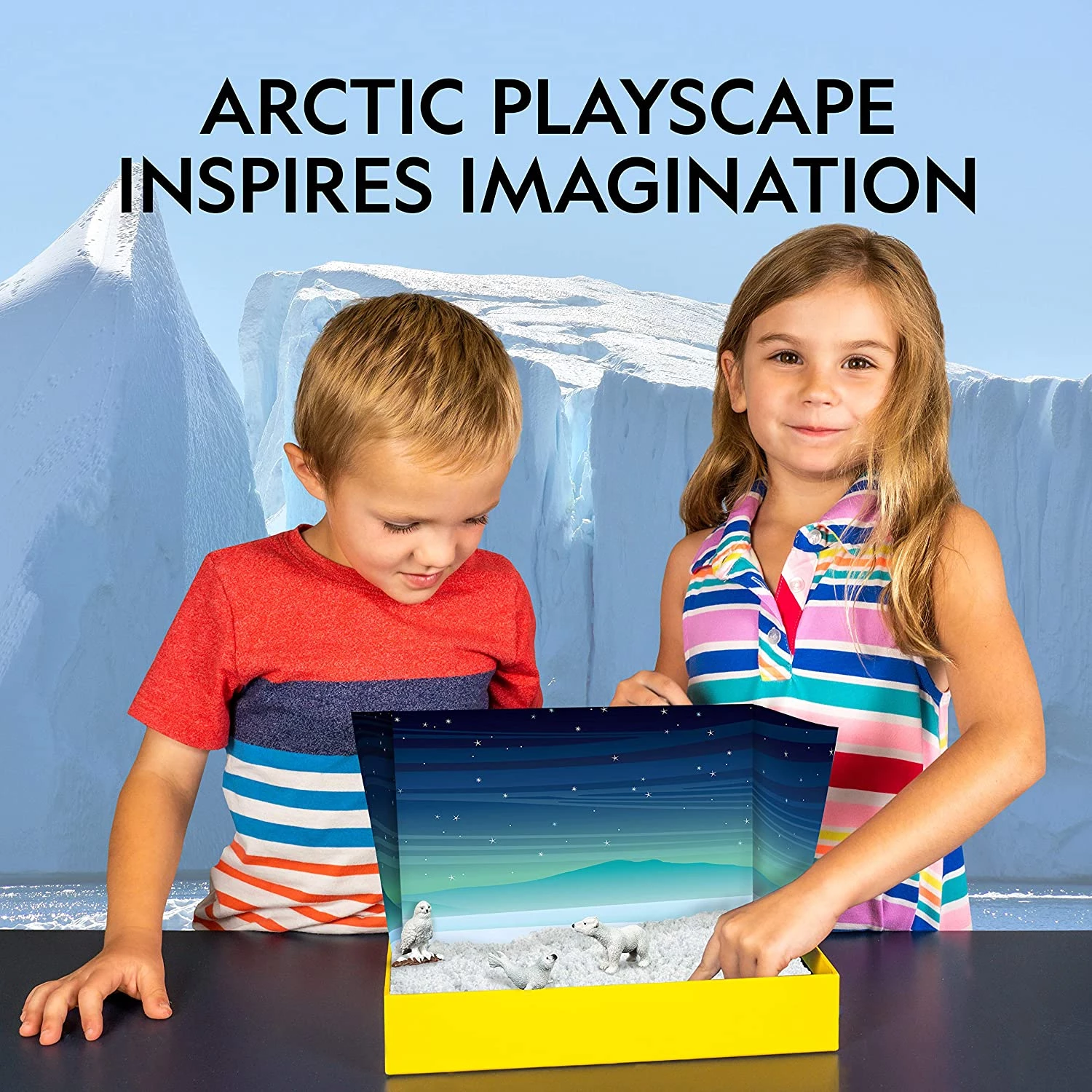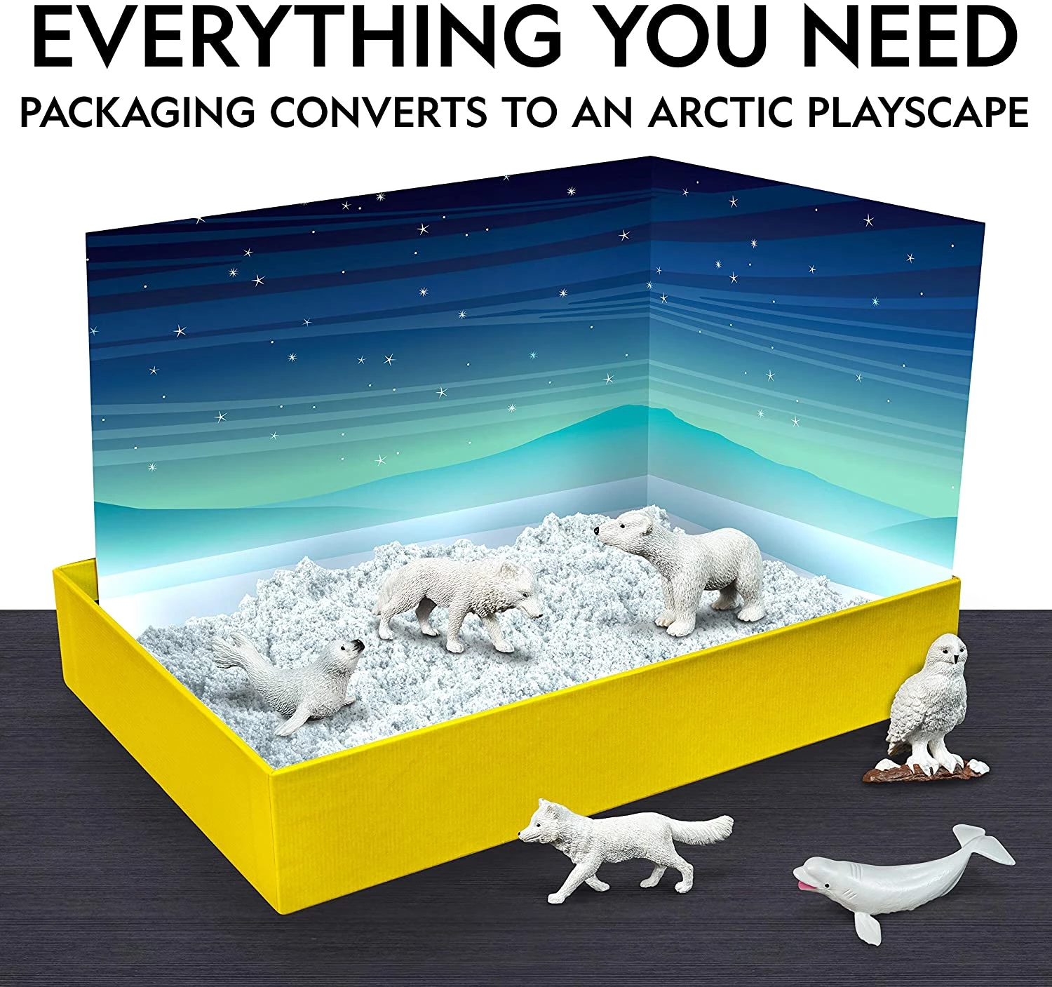 В комплект входят 6 фигур арктических животных, а упаковка превращается в игровое пространство с диорамой. Этот уникальный материал настолько легок, что 3 чашки песка, представленные в этом наборе, весят всего 200 грамм! Песок не оставляет пятен на руках и не прилипает к рукам, поэтому его легко чистить с поверхностей, включая ковер.