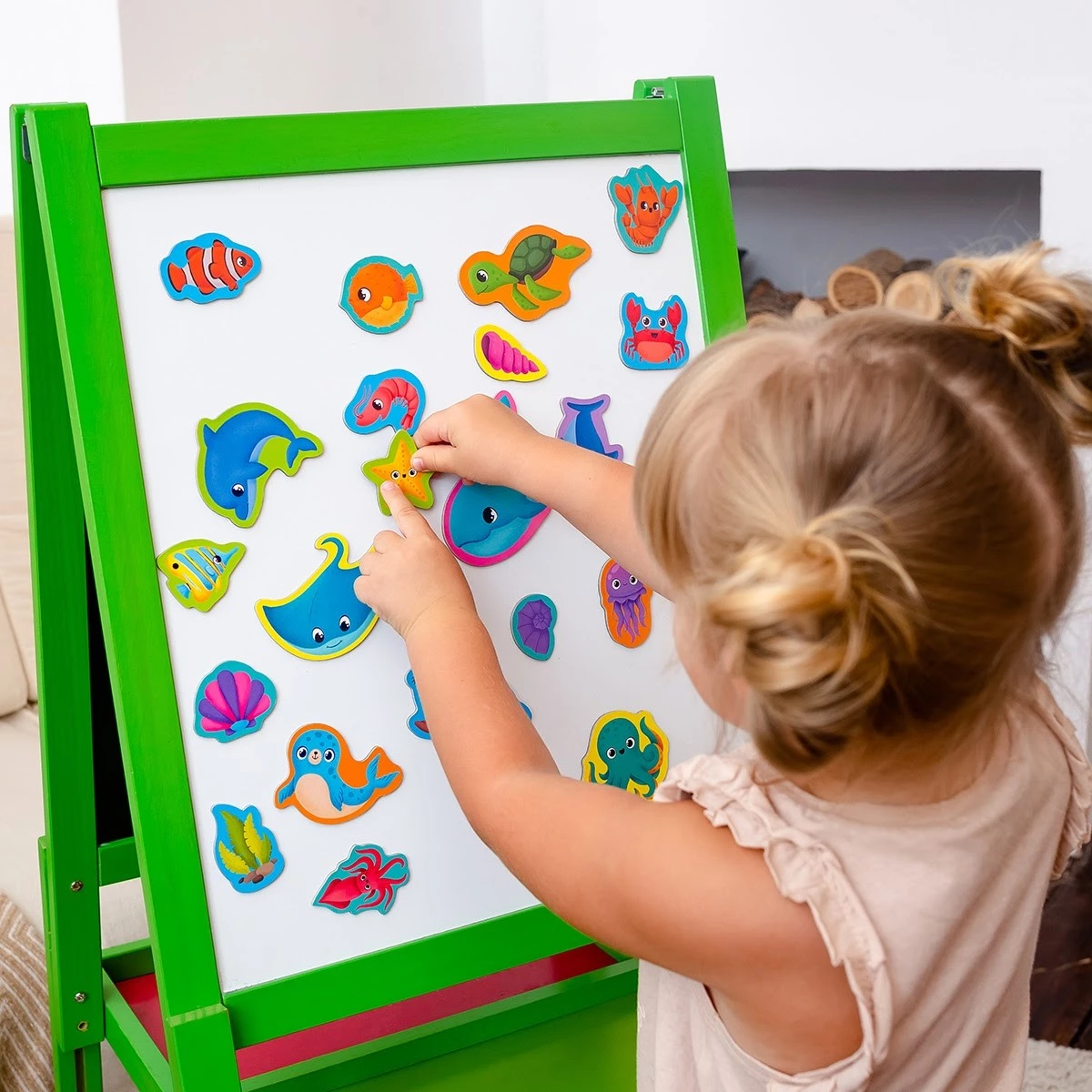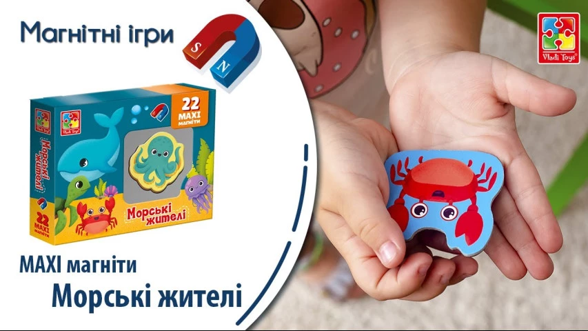 Изучайте обитателей моря с этим набором, включающим в себя 22 ярких магнита. Рассмотрите вместе с ребенком все магнитные фигурки в виде животных подводного мира. Расскажите ребенку, как они называются. Чем отличаются? С магнитами морских обитателей можно придумывать разные истории. Играть можно на холодильнике или на любой другой магнитной поверхности.