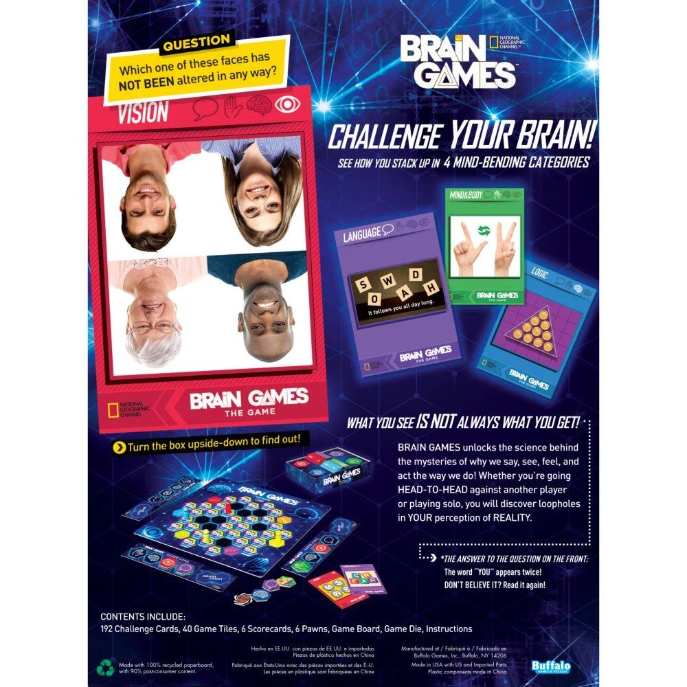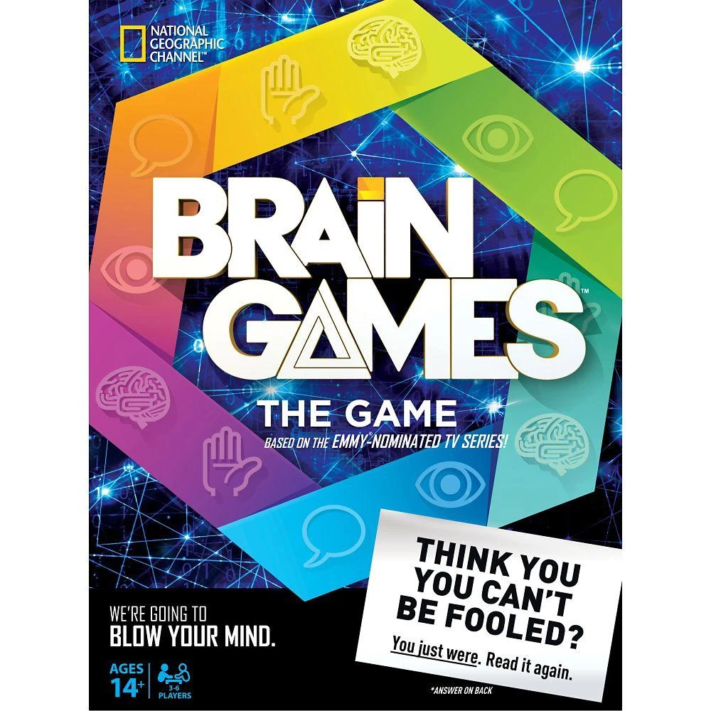 Развивайте свой ум с помощью этой увлекательной настольной игры для повышения интеллекта, основанной на популярном шоу Brain Games на канале National Geographic. Игра отлично подходит для вечеринки или веселого семейного вечера. Вы можете соревноваться с другими игроками в веселых тестах на логику, зрение, языковые навыки и физические навыки.