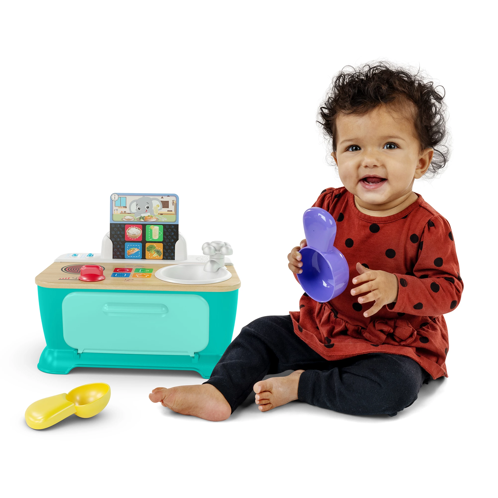 Оснащенная духовкой, плитой и раковиной, детская кухня от Baby Einstein предлагает два режима игры. В игровом режиме малыши будут знакомиться с мелодиями и звуками приготовления пищи. Режим обучения позволит ребенку изучать цвета, формы, а также названия продуктов питания на английском, французском, немецком и испанском языках. Игровой набор включает в себя 3 карточки с «рецептами», которые помогут ребенку «приготовить» 6 блюд на завтрак, обед или ужин. Для этого в комплекте предусмотрены кастрюля и ложка.