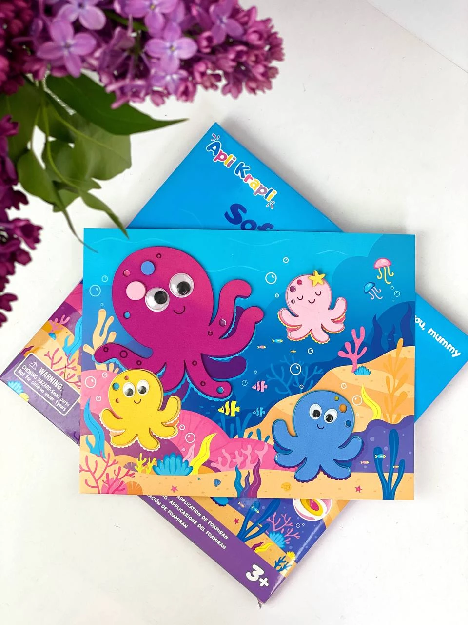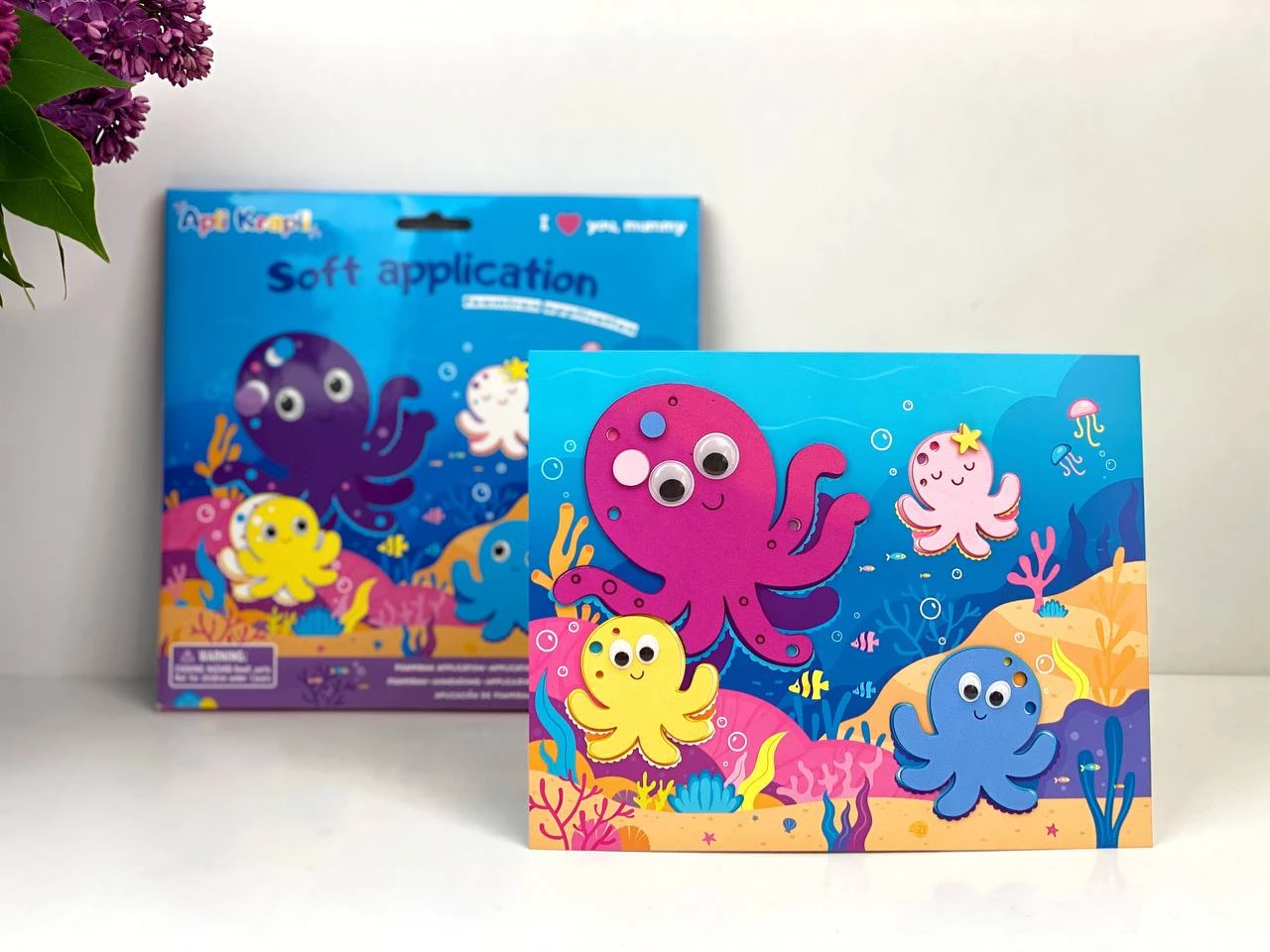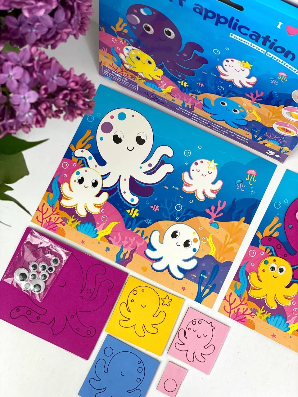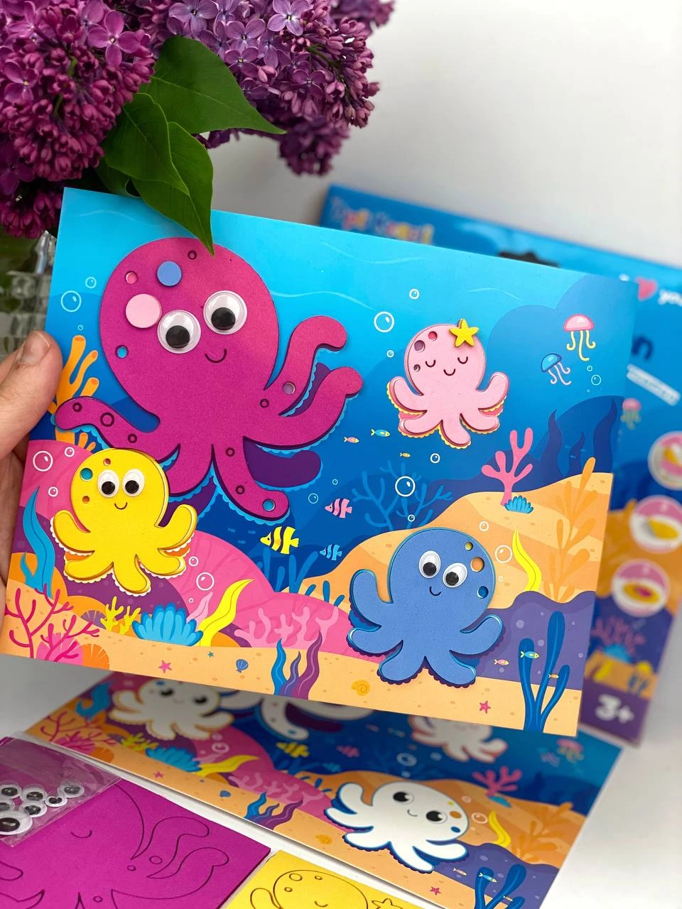 Создай картинку с осьминогами, используя предварительно вырезанные наклейки. Набор идеально подходит для творческого развития и развития мелкой моторики. Увлекательное занятие для дошкольников и деток младшего школьного возраста, которое знакомит малышей с основами рукоделия и морскими обитателями.