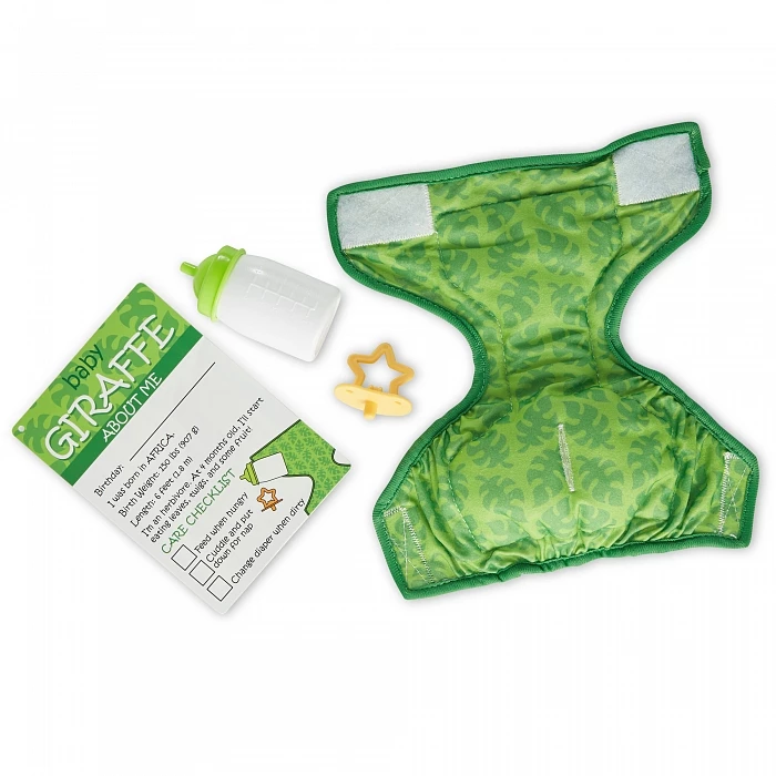 У этого малыша мягкая, приятная на ощупь шерстка, изготовленная из качественного, гипоаллергенного материала, забавное личико, большие ушки и белые рожки. Зверушка выполнена в сидячей позе. Для ухода за малышом в комплекте имеются соска, бутылочка для кормления, а также подгузник. Кроме вышеперечисленных аксессуаров вы найдете в данном наборе специальную карточку для многоразового использования с сертификатом про усыновление, контрольным списком ухода и интересными фактами про жирафов. Ребенку в возрасте от 2-х лет непременно понравится заботится об этом питомце.