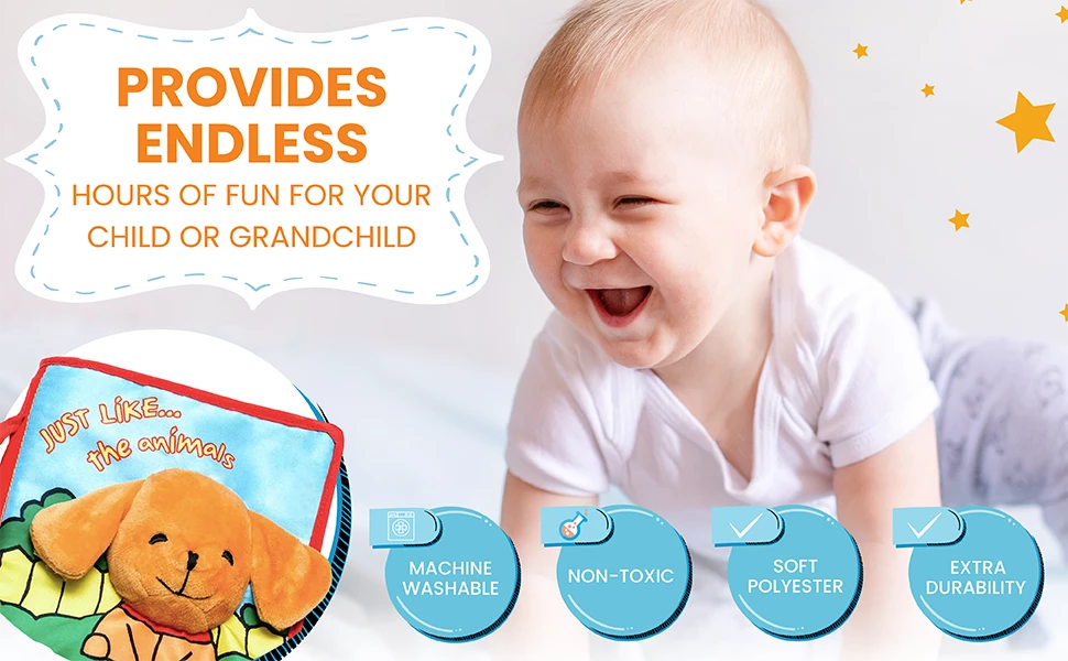 Эта увлекательная книжка разработана экспертами в США. Книжка с яркими страницами и милыми животными. Идеально подходит для новорожденных малышей. Прекрасный способ стимулировать языковые и сенсорные навыки. На каждой странице есть небольшой текст, и ребенок сможет его понять, а потом и научится читать эти стишки. Эта мягкая книга нетоксична и безопасна для ребенка.