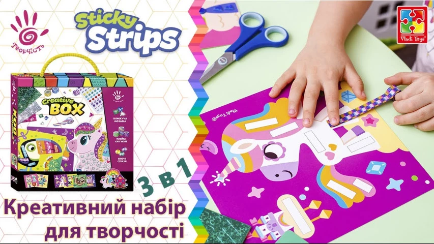 Создавай неповторимые шедевры с набором для творчества «Единорог». Перед тобой не просто набор для творчества, а настоящая творческая мастерская. Еще бы, ведь в этом наборе спрятано сразу три вида творчества! В красивой подарочной коробке ты найдешь сияющие клейкие полоски, блестящую мозаику и гламурные стразы. Набор включает в себя 9 сюжетных картинок с единорогами и другими персонажами. Дополни их различными элементами, и изображения, словно по волшебству, засияют новыми цветами. Просто приклей полоску или стразы в нужные места на картинке.