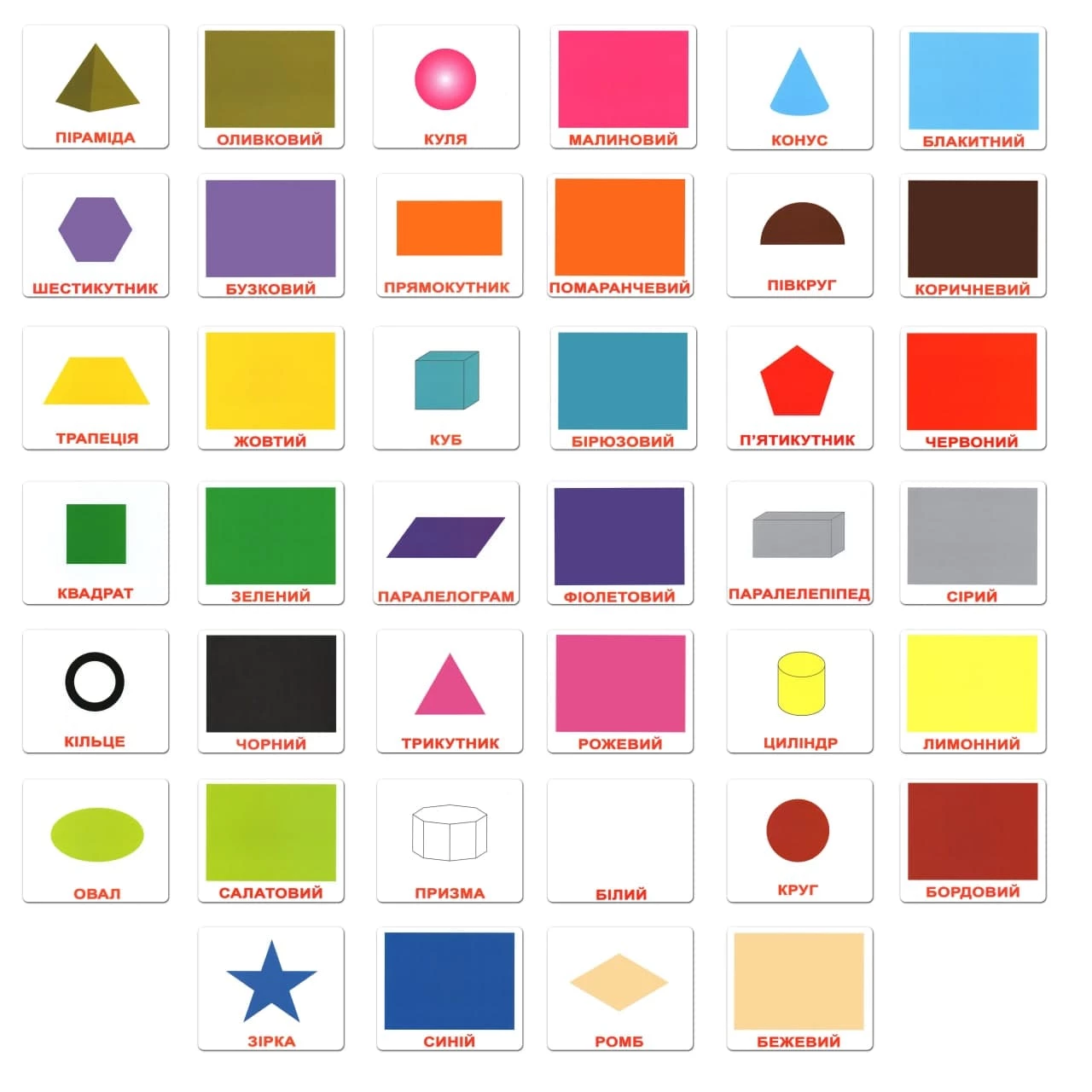 - Набор «Форма и цвет» 2 в 1. В набор входят 20 карточек с изображением цвета с одной стороны и геометрической фигуры с другой стороны. Набор «Форма» и «Цвет» — это две темы и показывать эти карточки вперемешку или подряд не стоит.