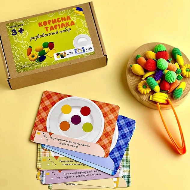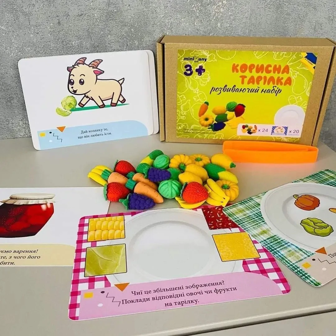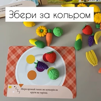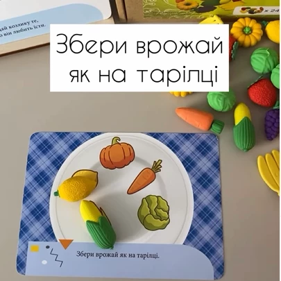 Принцип игры довольно интересный: необходимо раскладывать овощи и фрукты по тарелочкам, руководствуясь заданиями на карточках. Интересная игра надолго увлечет маленьких фантазеров. Элементы набора приятные на ощупь, изготовлены из качественных материалов и не имеют запаха.