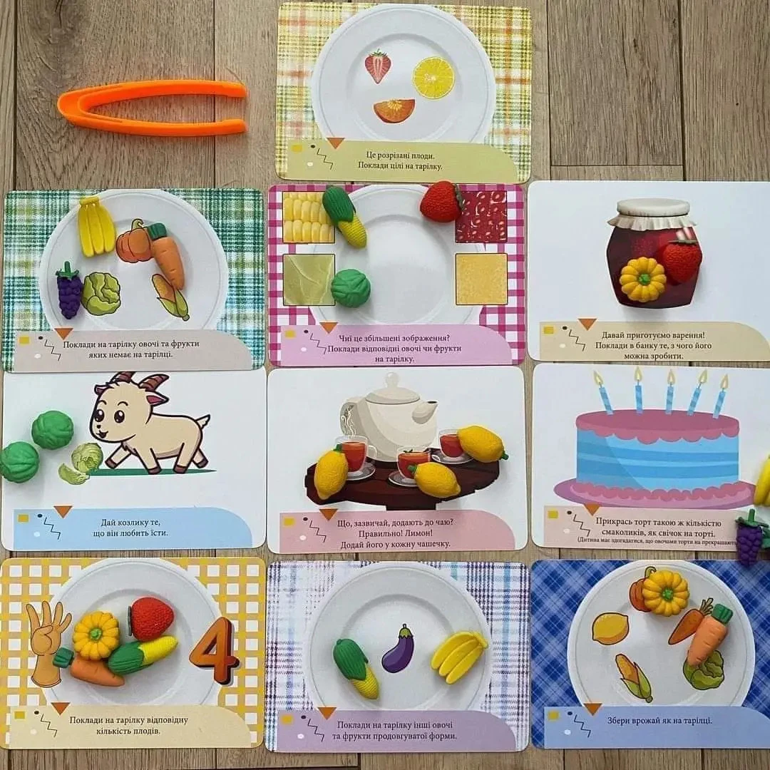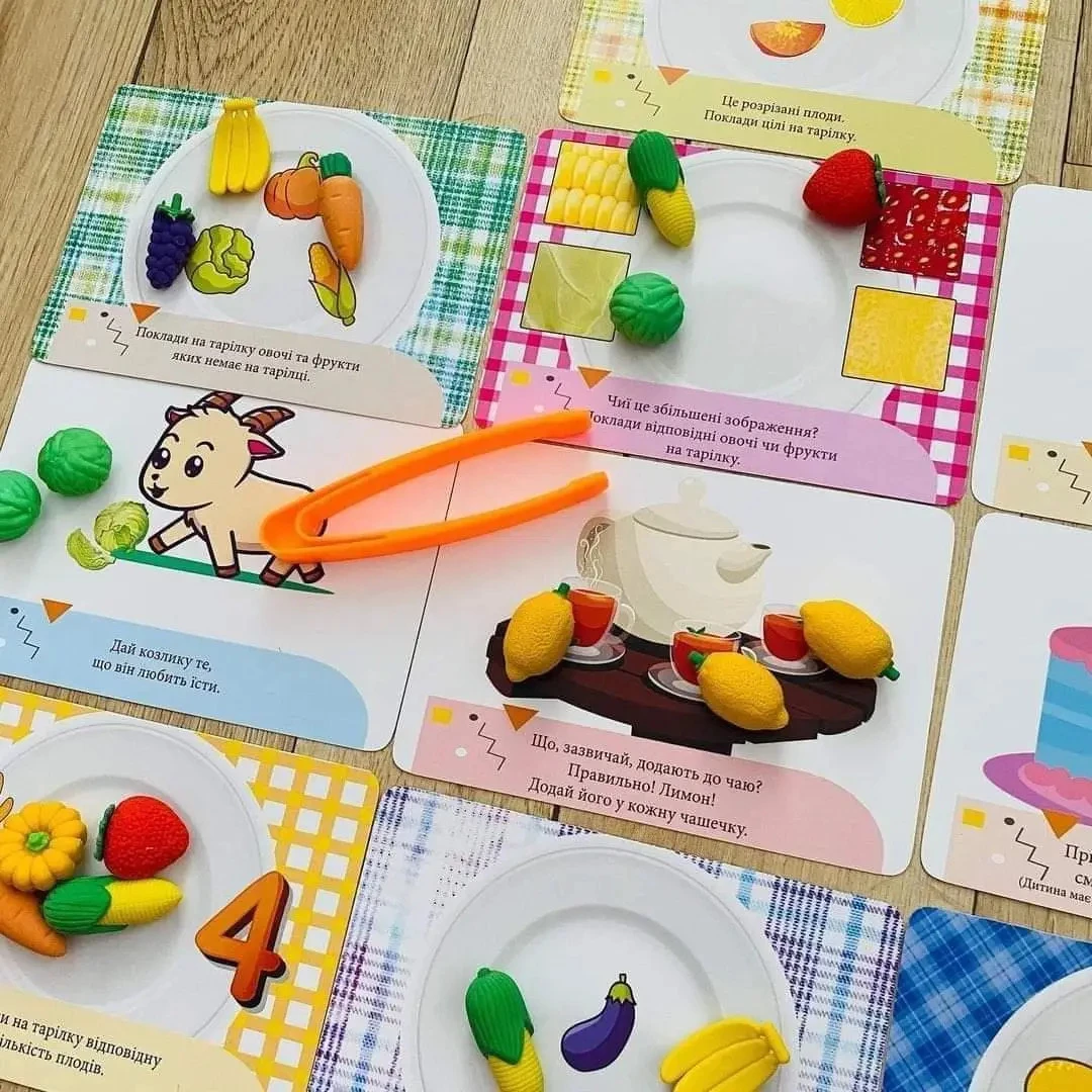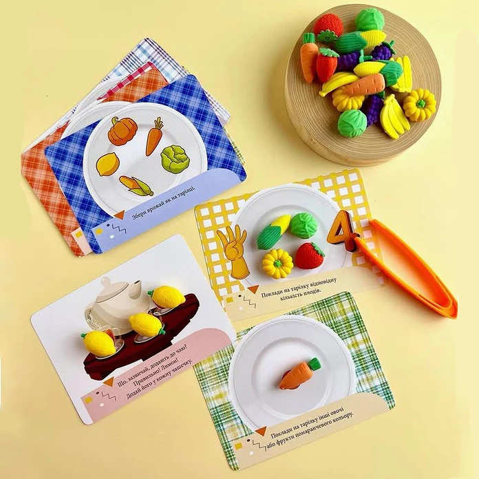 Отличная игра Монтессори для тренировки мелкой моторики, изучения цвета и счета. Представленный набор включает в себя 10 двусторонних карточек с заданиями (20 заданий), пинцет, а также 24 фигурки в виде овощей и фруктов.