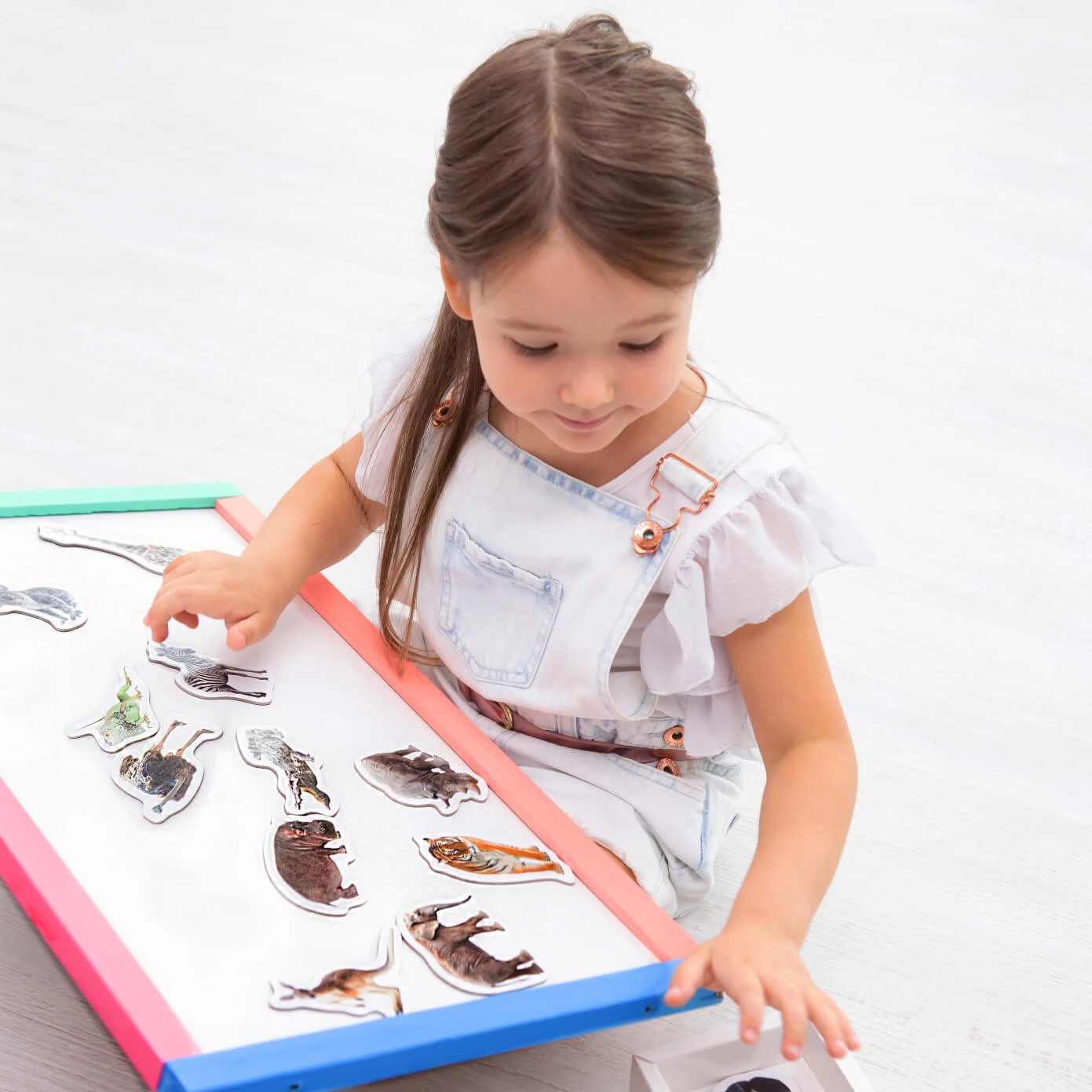 В процессе игры ребенок узнает, как называется то или иное животное, где оно обитает и чем отличается от других представителей фауны. Магнитные фигурки можно сортировать по размеру, пересчитывать их. Кроме того, животных можно сортировать по их индивидуальным особенностям: кто ползает, кто летает, у кого есть полоски. Магниты также позволяют придумывать всевозможные истории, сказки, игровые сюжеты.
