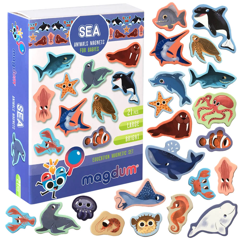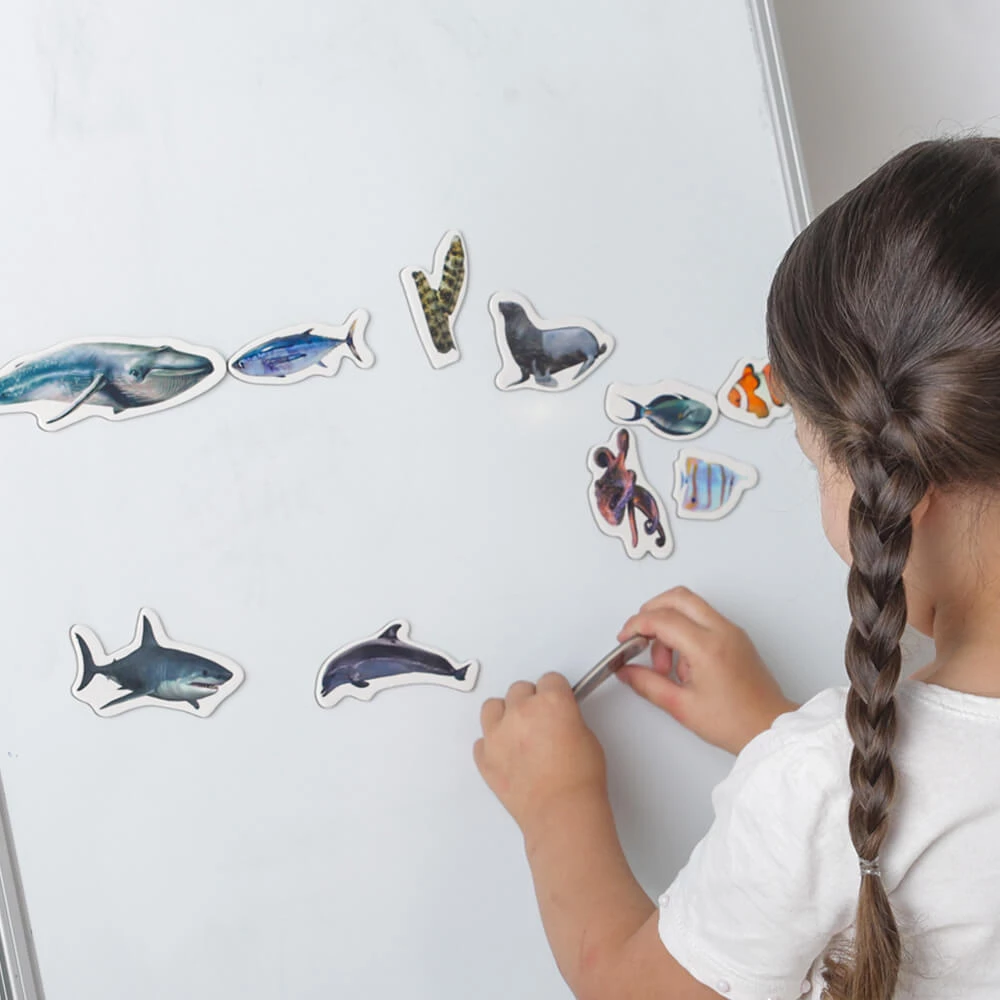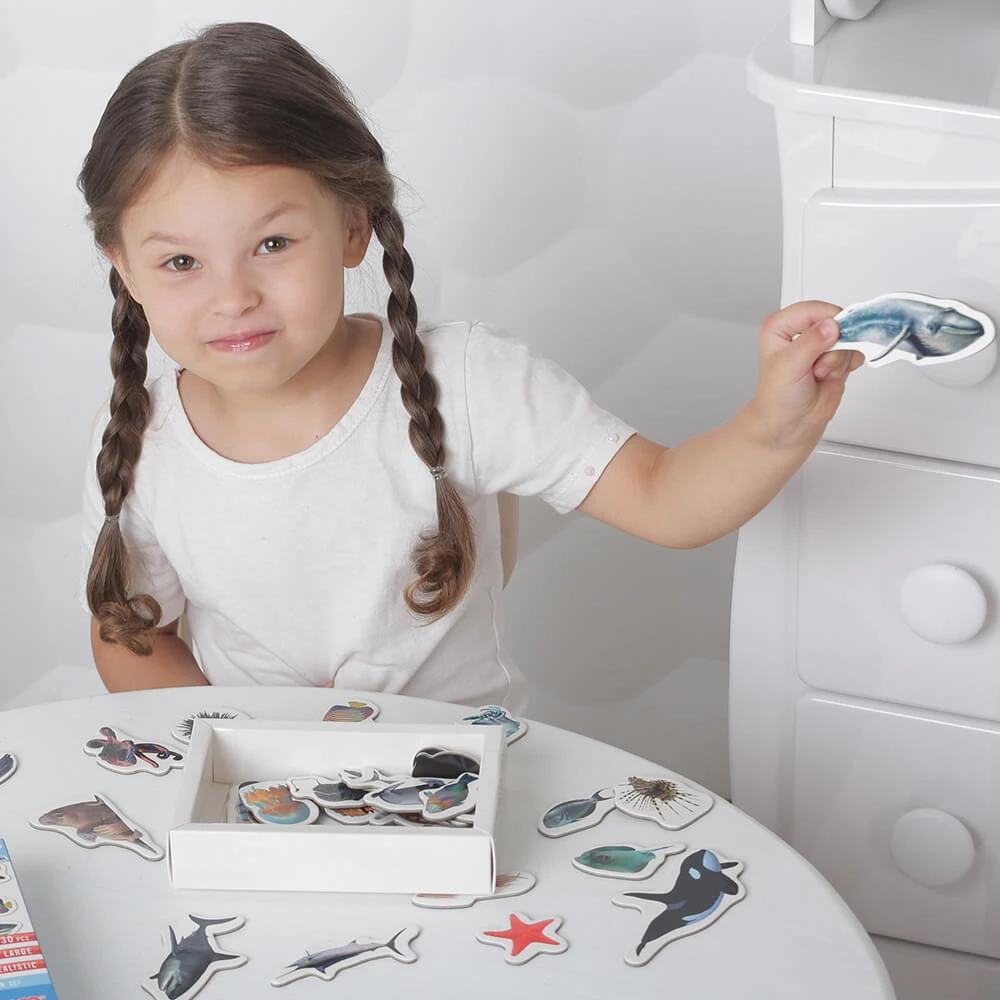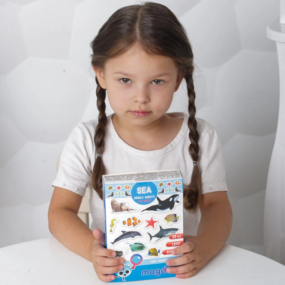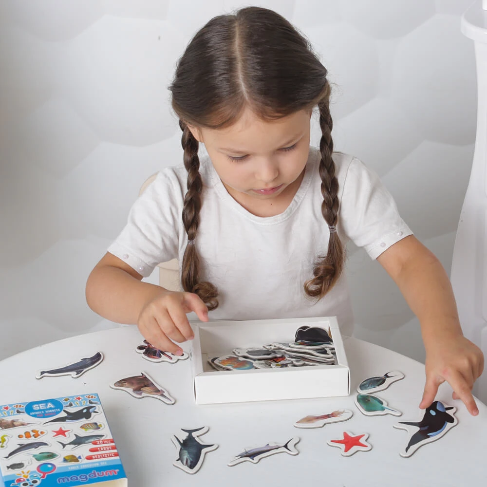 Знакомьтесь с морскими животными, учите их названия, узнавайте интересные факты. Магнитные фигурки можно сортировать по цвету, размерам и другим особенностям. Например, можно выбрать таких существ, у которых есть плавники. Большое количество магнитов также позволяет придумывать увлекательные истории и сюжеты для игр.