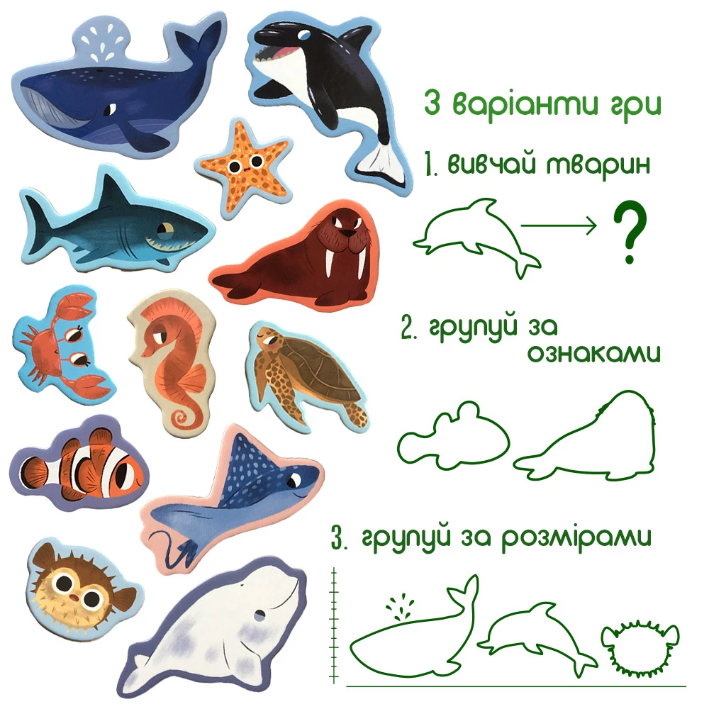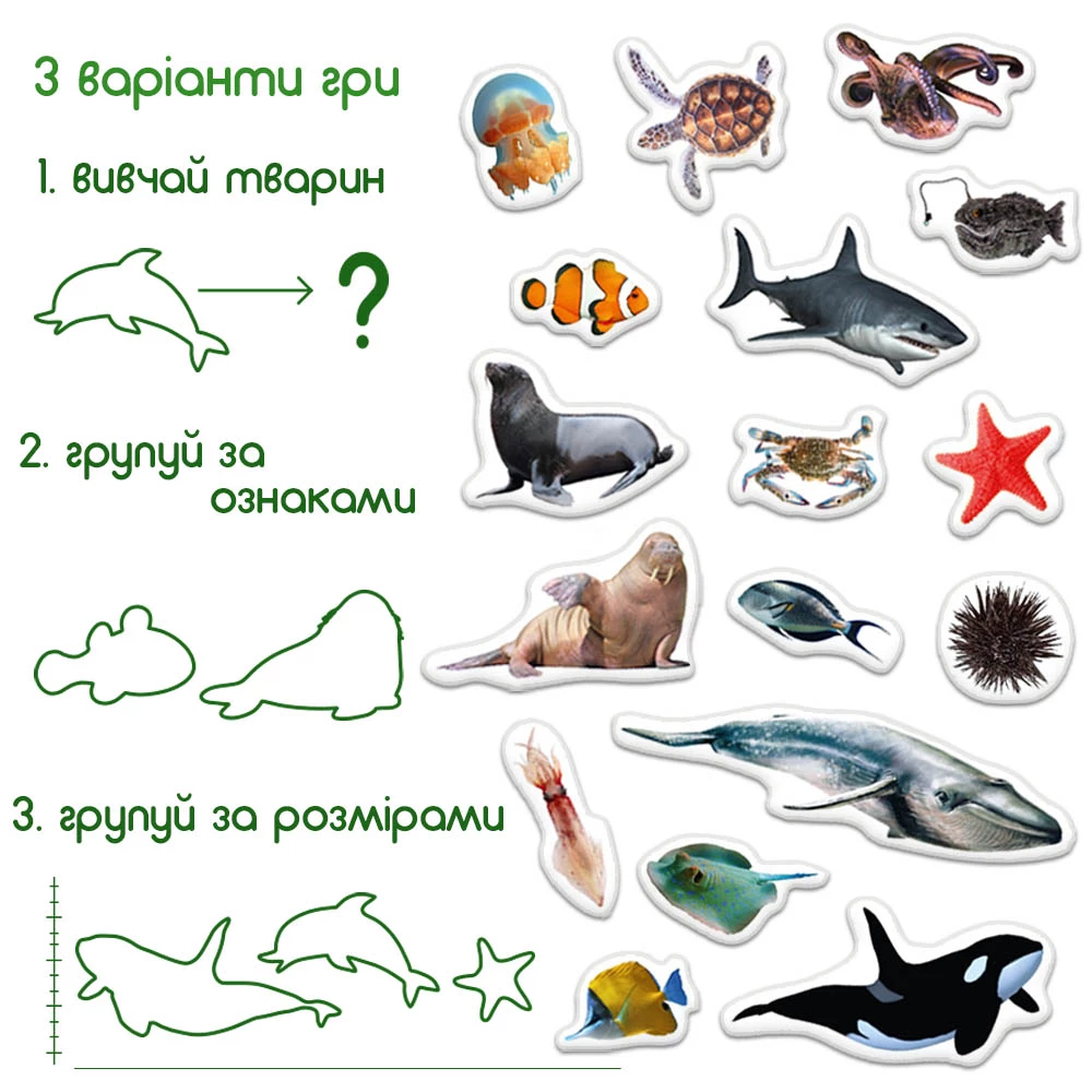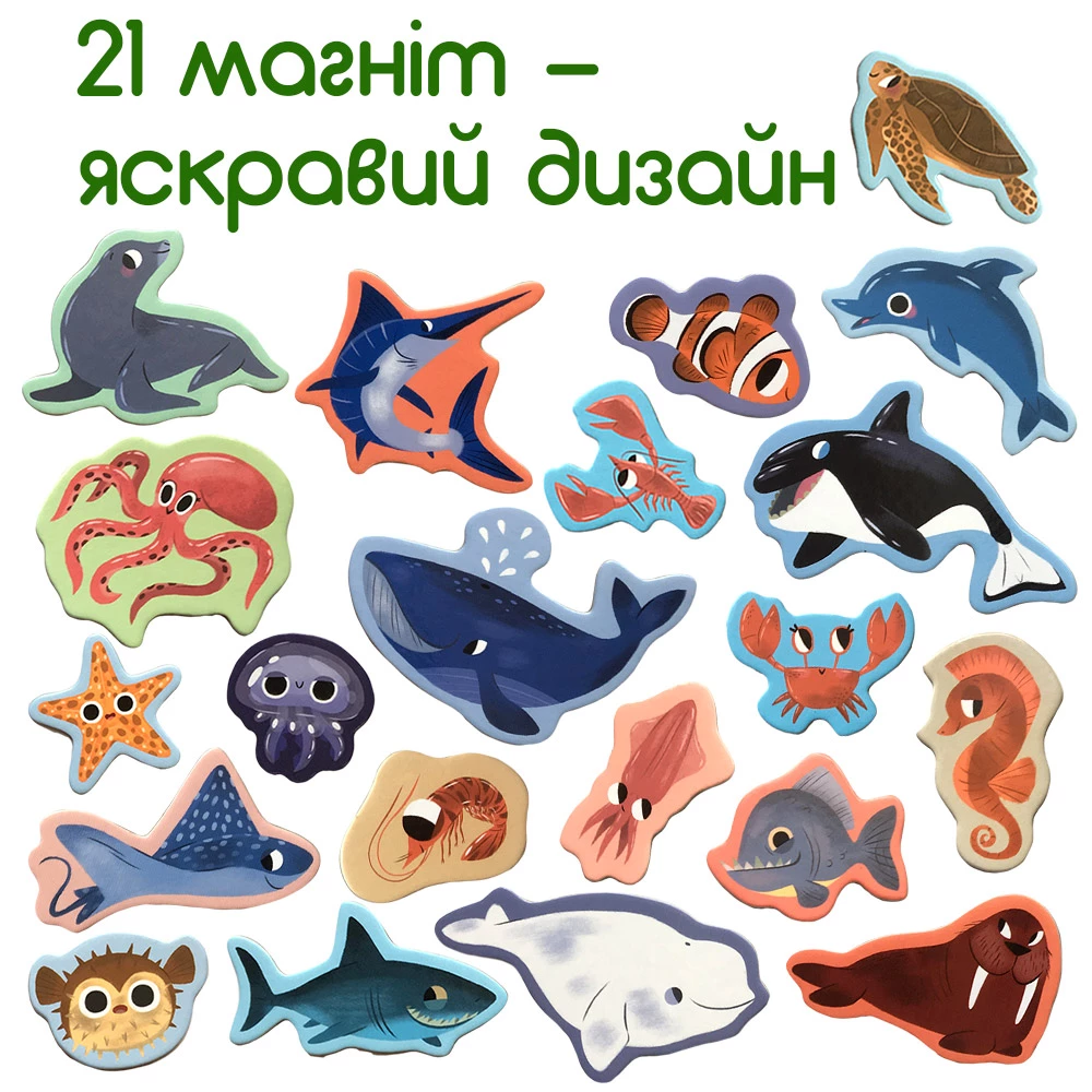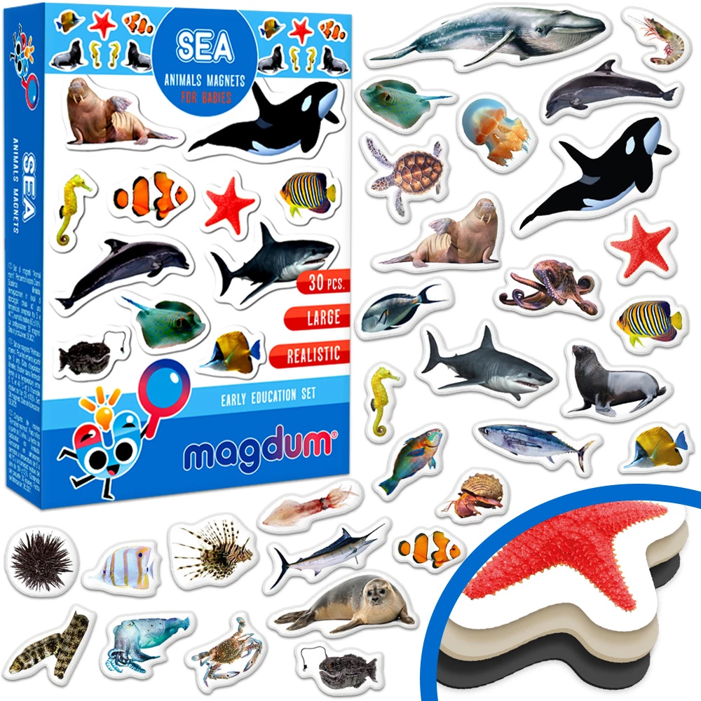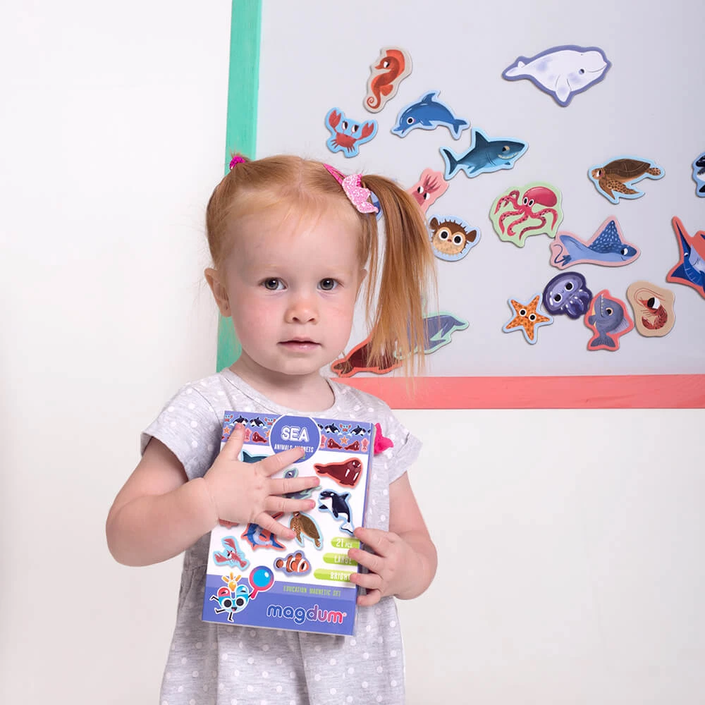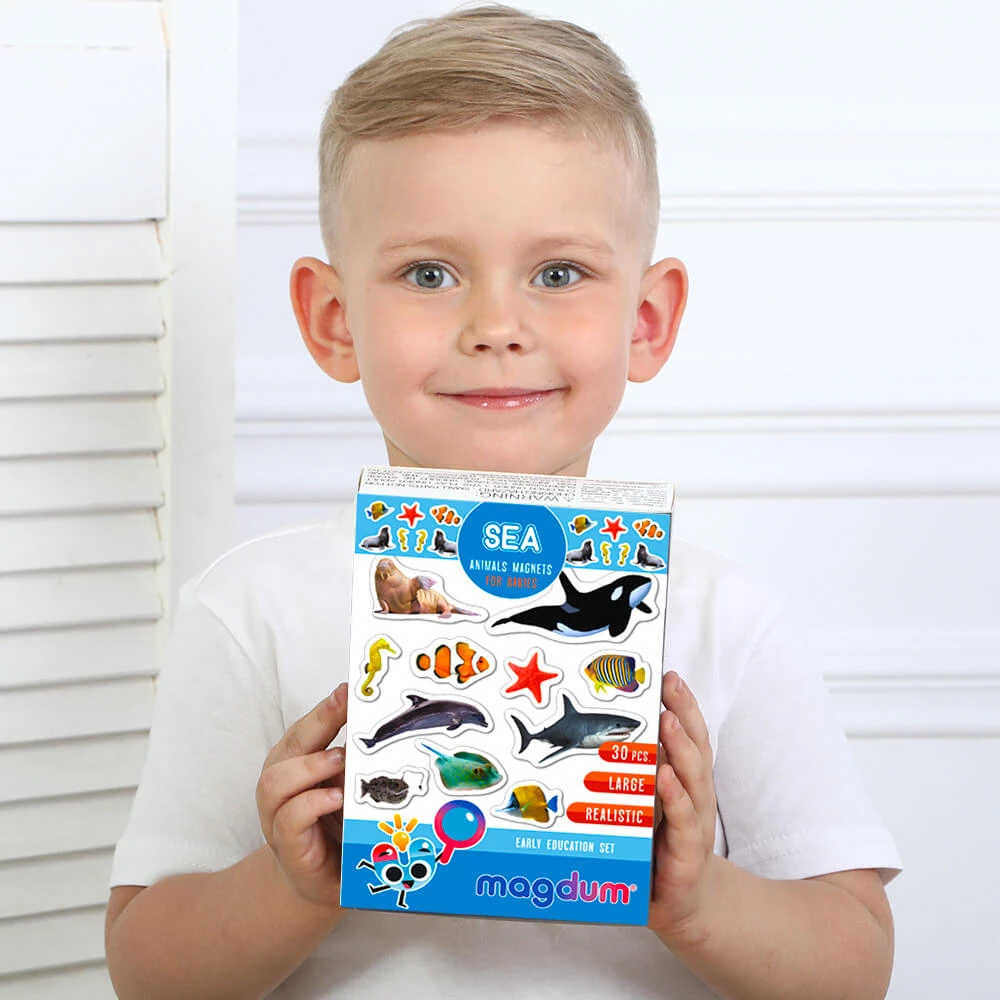 Знакомьтесь с морскими животными, учите их названия, узнавайте интересные факты. Магнитные фигурки можно сортировать по цвету, размерам и другим особенностям. Например, можно выбрать таких существ, у которых есть плавники. Большое количество магнитов также позволяет придумывать увлекательные истории и сюжеты для игр.