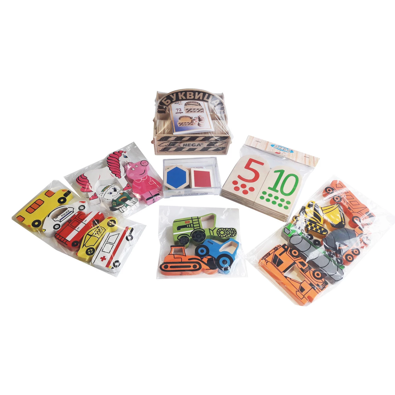 Представленный обучающий комплект от торговой марки Hega включает в себя 5 наборов для учебы и игры. Это — отличный подарок для дошкольников.