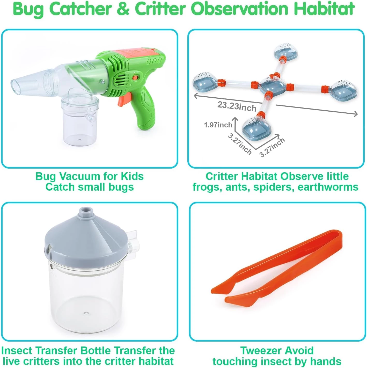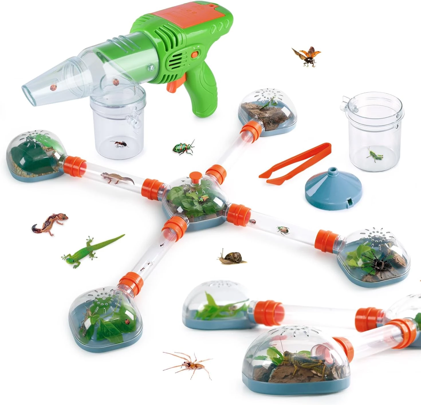 Набор включает в себя пистолет для ловли насекомых и жуков, съемные трубки, чашу для наблюдения, пинцет и воронку — все что нужно юному энтомологу.