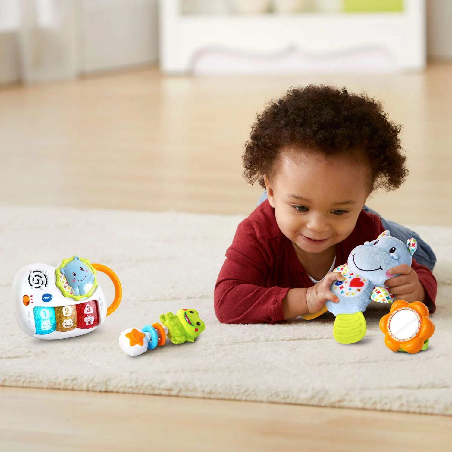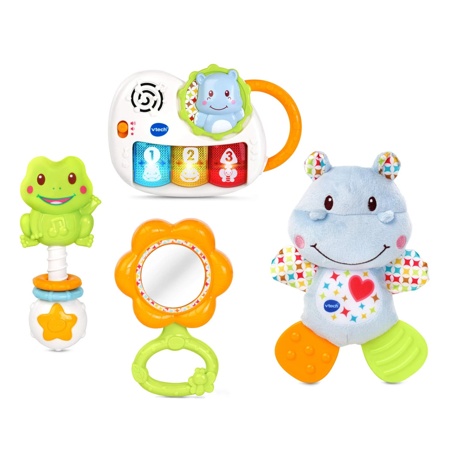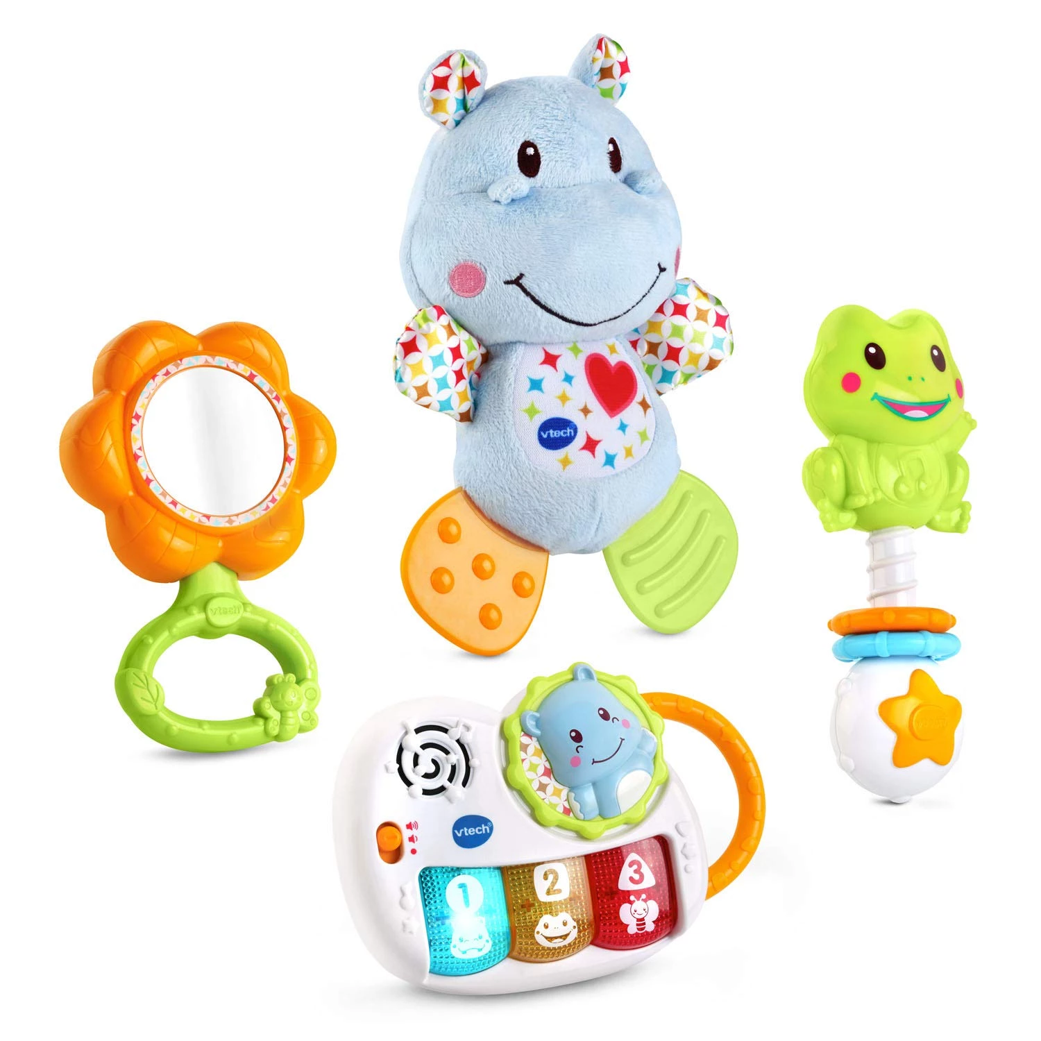Идеальный подарочный набор из четырех предметов для новорожденных. В наборе лягушка погремушка, мягкий бегемотик, музыкальная электронная игрушка фортепиано и безопасным для ребенка цветочком с зеркалом.