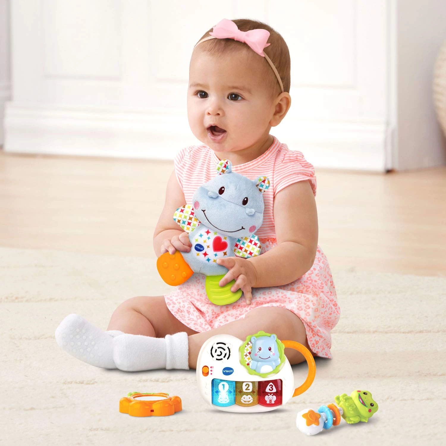Мягкий плюшевый бегемотик имеет складчатые ручки и изготовлен из ткани с различными текстурами с двумя прорезывателями для успокоения десен.