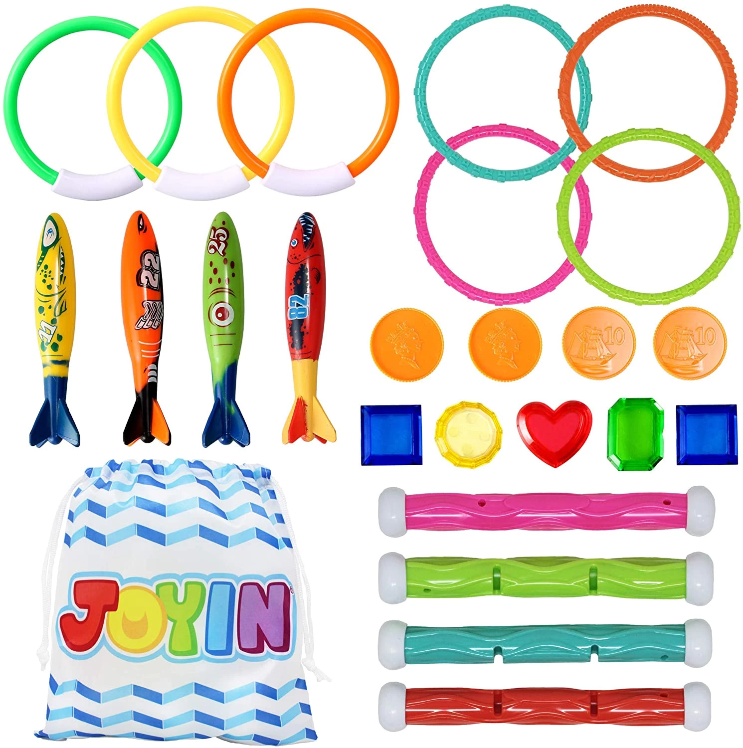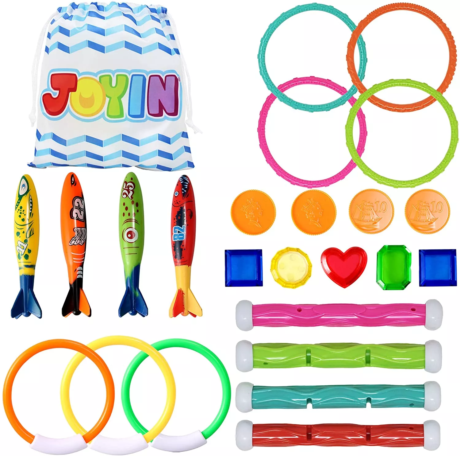 В наборе игрушек для бассейна - 24 предмета в ярких цветах: 7 колец для дайвинга (2 типа), 4 палки для ныряния, 4 игрушки для бассейна с торпедами и 9 пиратских сокровищ (5 драгоценных камней и 4 монеты). Кольца и палки для дайвинга вертикально стоят на дне бассейна, и их можно легко схватить. Эти подводные игрушки не только приносят детям огромное удовольствие во время плавания, но и помогают улучшить навыки дайвинга.