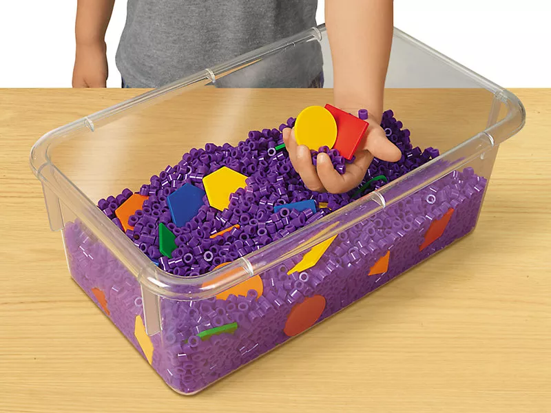 Дети развивают чувство осязания, когда ищут формы среди трубочек в сенсорном боксе. Вместительный бокс вмещает около 907 грамм фиолетовых пластиковых трубочек и 25 пластиковых форм разного цвета. Формы прочные и их можно мыть. Прозрачный бокс идет с крышкой для удобного хранения набора.
