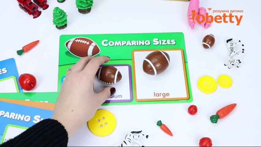 Нужно просто на игровой карточке правильно сортировать яблоки, футбольные мячи, зебр и другие фигурки по размеру.