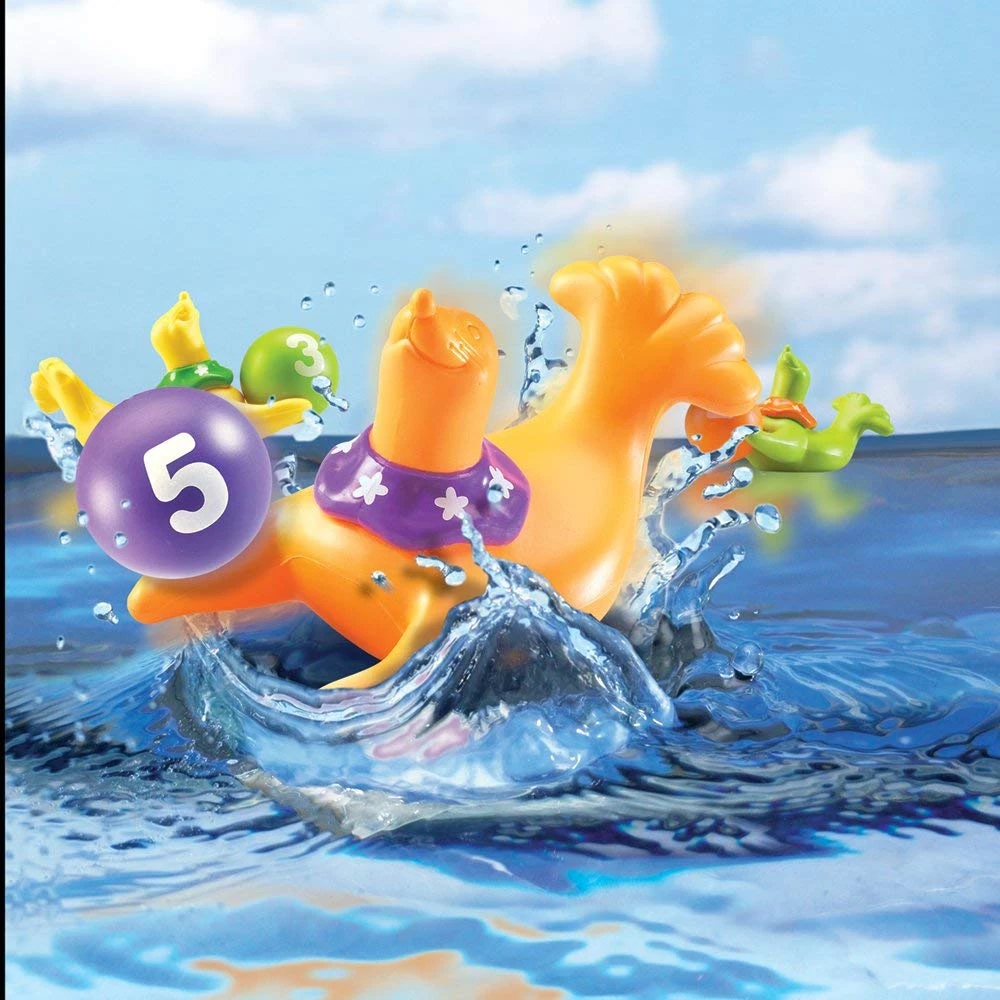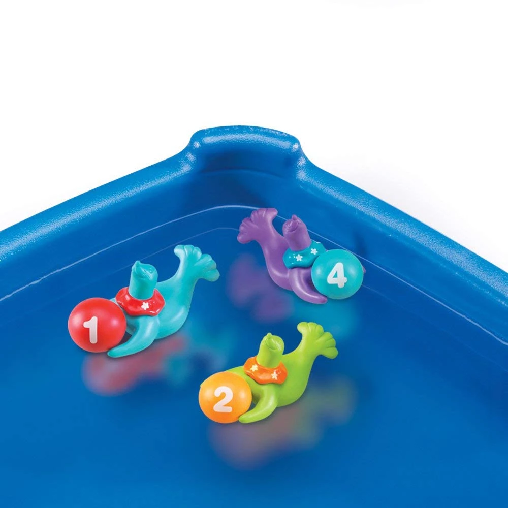 При помощи этих забавных морских котиков ребенок изучает числа. Эти фигурки отлично развивают мелкую моторику рук, шарики с правильными цифрами вставляются очень легко. фигурки хорошо плавают в воде. Рекомендую!