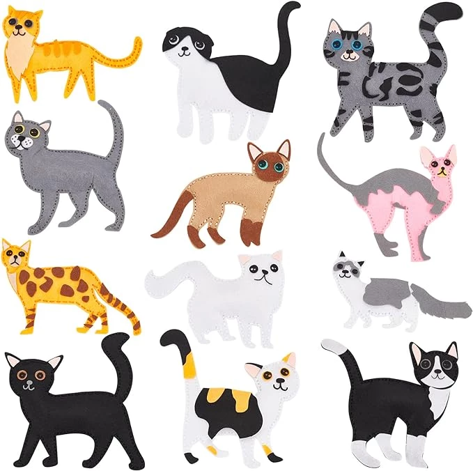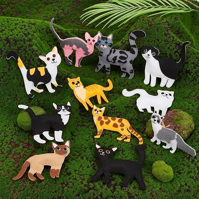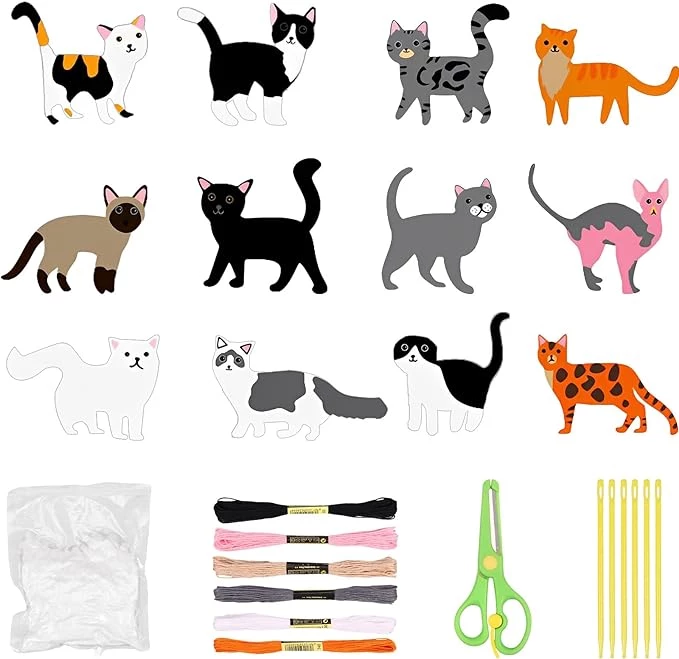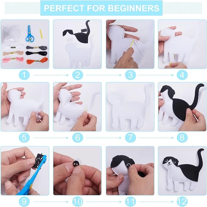 Что входит в набор? 12 вырезанных фигурок, 35 самоклеящихся липучек, 6 пластиковых игл, 7 мотков ниток, безопасные ножницы, 12 индивидуальных инструкций к каждой фигурке, наполнитель. Простые инструкции гарантируют, что вы создадите красивых котят. Даже если вы никогда раньше не занимались шитьем.