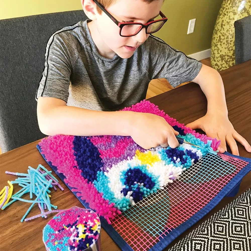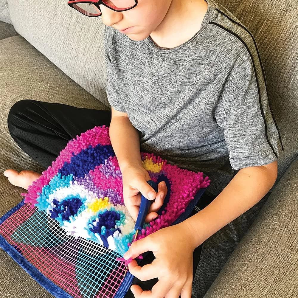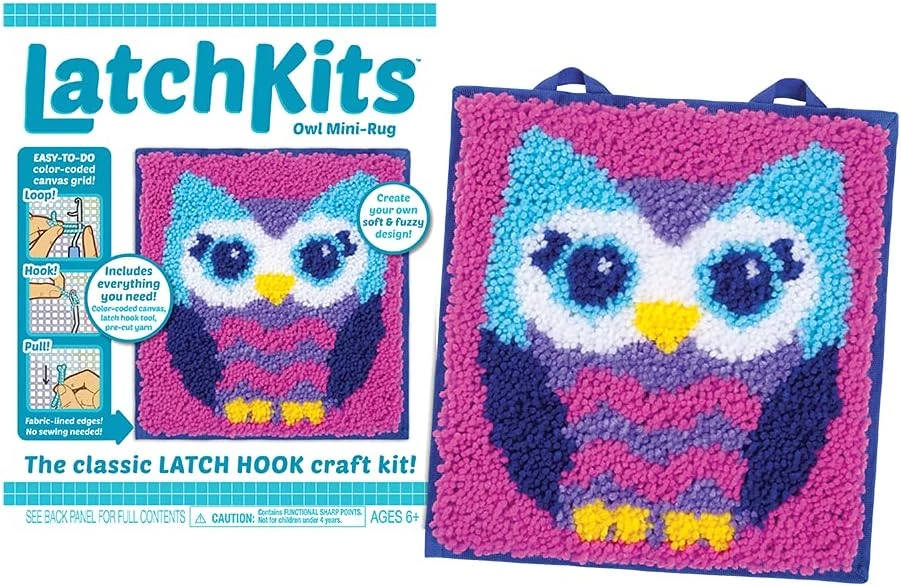 Встречайте классический набор для рукоделия с крючком-защелкой! LatchKets – это полезное, забавное и простое в освоении ремесло — просто закрепите петлю, зацепите и потяните! Все, что вам нужно, включено в комплект: удобный крючок-защелка, предварительно нарезанная пряжа и канва с цветовой маркировкой, за которой легко следить, чтобы начать работу над ваши арт-проектом было проще простого. Прочный холст с краями на тканевой подкладке и петлями для подвешивания позволяет создать свой собственный мягкий и пушистый дизайн, который можно повесить на стену или использовать в качестве мини-коврика — это отличный проект в любое время!