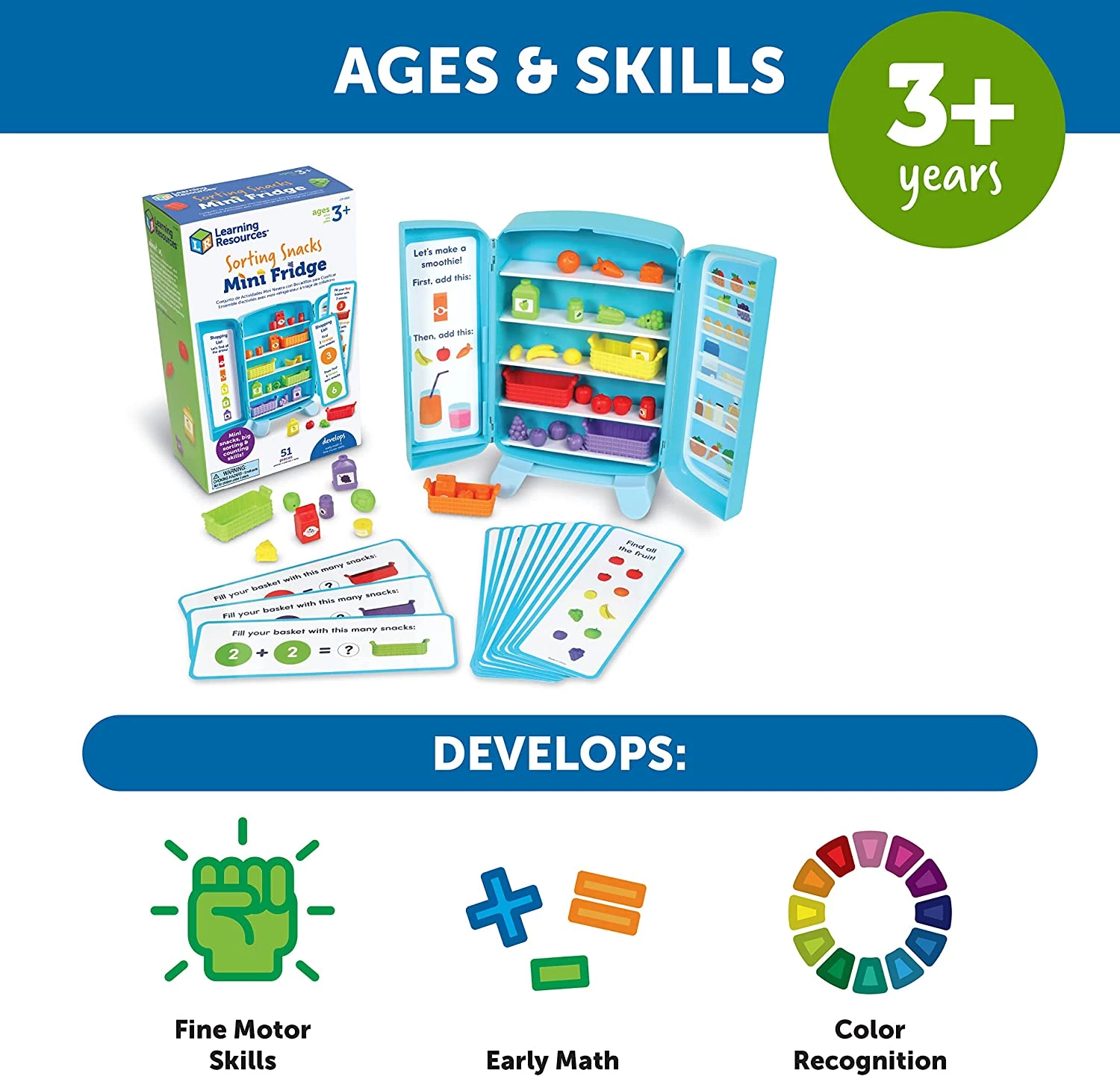 Этот набор для сортировки и счета от торговой марки Learning Resources развивает важные математические навыки. Дети получат новые навыки счета, сортировки и построения шаблонов. Внутри игрушечного холодильника ребенок обнаружит 30 миниатюрных продуктов, выполненных в 5 ярких цветах, а также 5 корзин для покупок, готовых к веселой сортировке. Ребенок может воспользоваться двусторонними карточками с заданиями и начать решать обучающие увлекательные задания — от сортировки по форме до сопоставления по цвету.