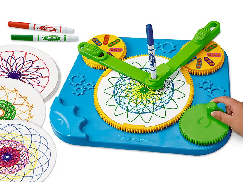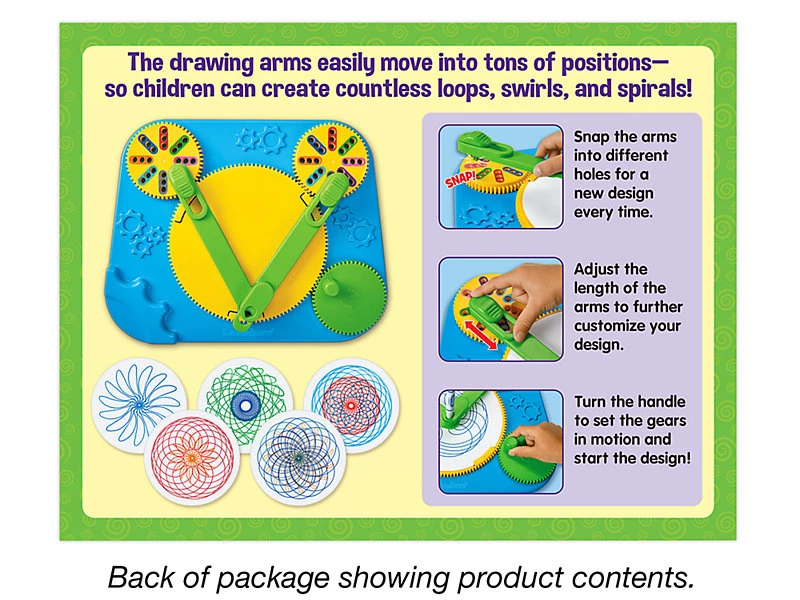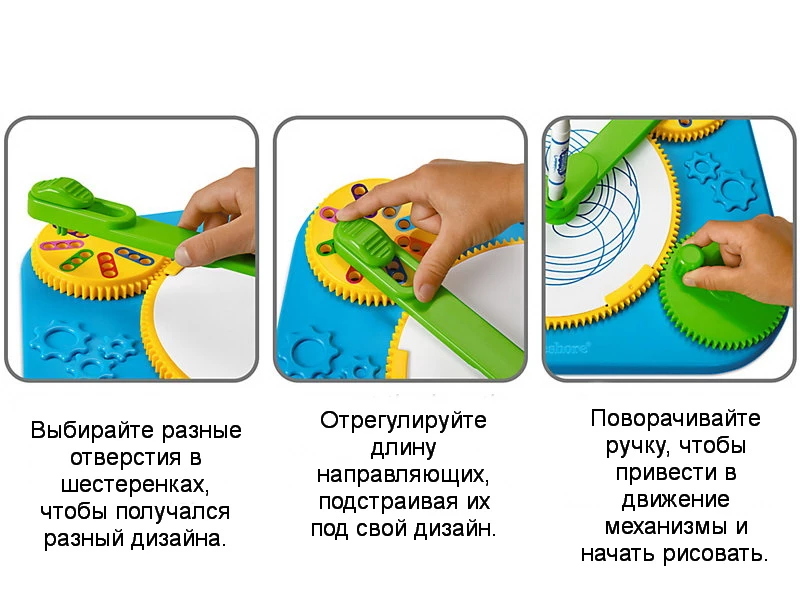 Рисование узоров и спиралей можно превратить в искусство! Дети просто вставляют фломастер или ручку, потом вставляют вытягивающие рычаги в нужные отверстия в шестеренках и поворачивают ручку. Начинают вращаться все 4 шестерни одновременно, создавая бесчисленные петли, узоры и спирали. Дети могут выбирать различные положения на шестеренках и легко регулировать их.
