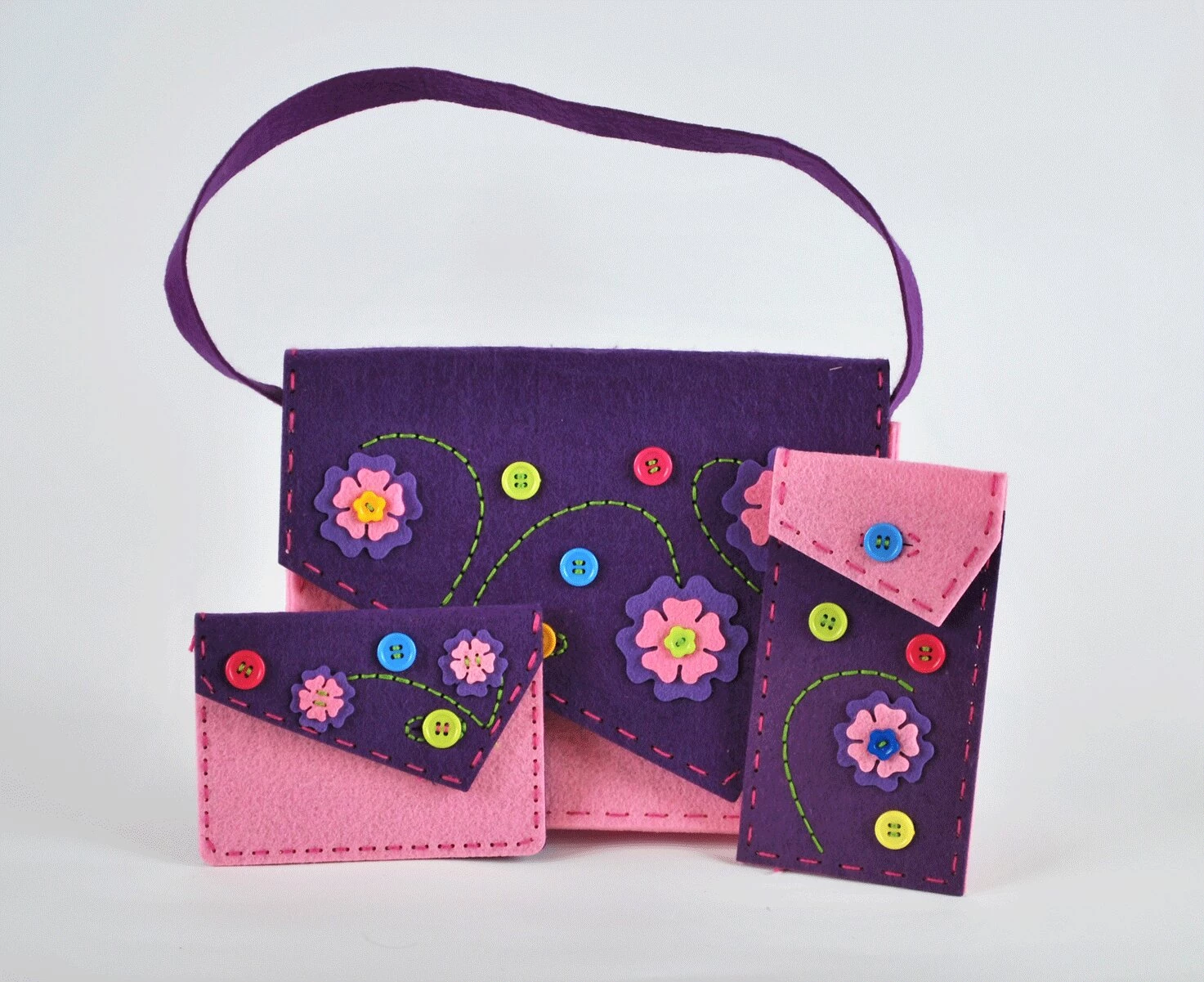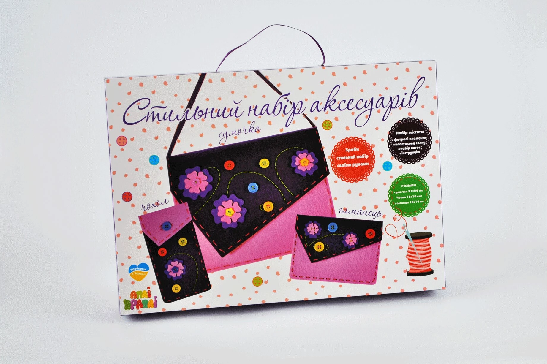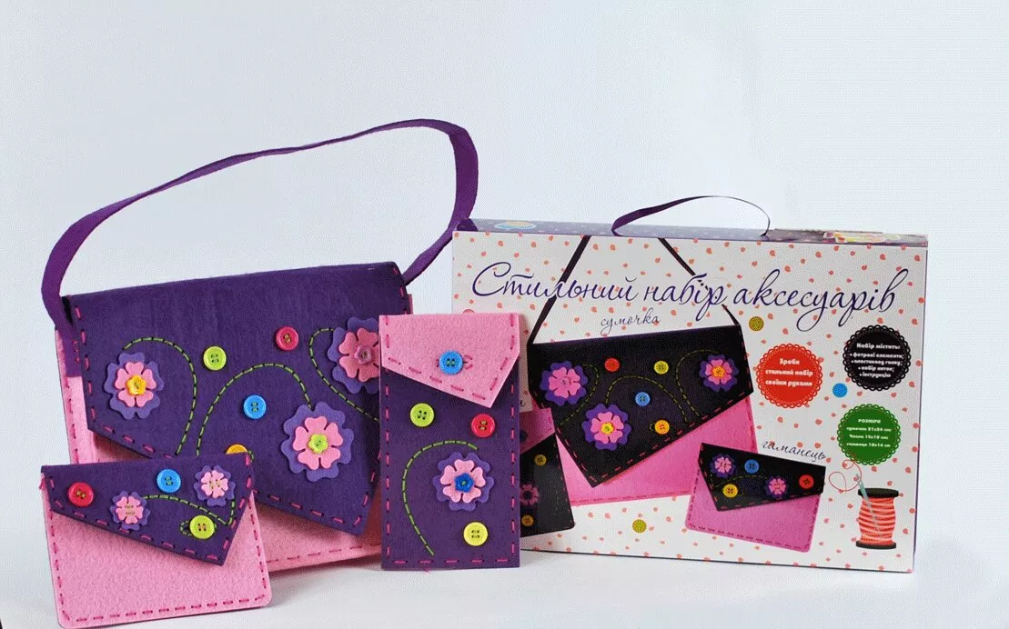Этот замечательный набор поможет создать стильные и оригинальные аксессуары для настоящей модницы. Нужно достать все элементы из коробки и разложить перед собой. После этого, взять инструкцию и внимательно изучить каждый шаг. Затем, необходимо использовать пластиковую иглу и специальные нитки. На фетровую основу нужно пришивать различные дизайнерские элементы (пуговки, цветочки). Из данного набора получается чехол для телефона, кошелек и сумочка-клатч.