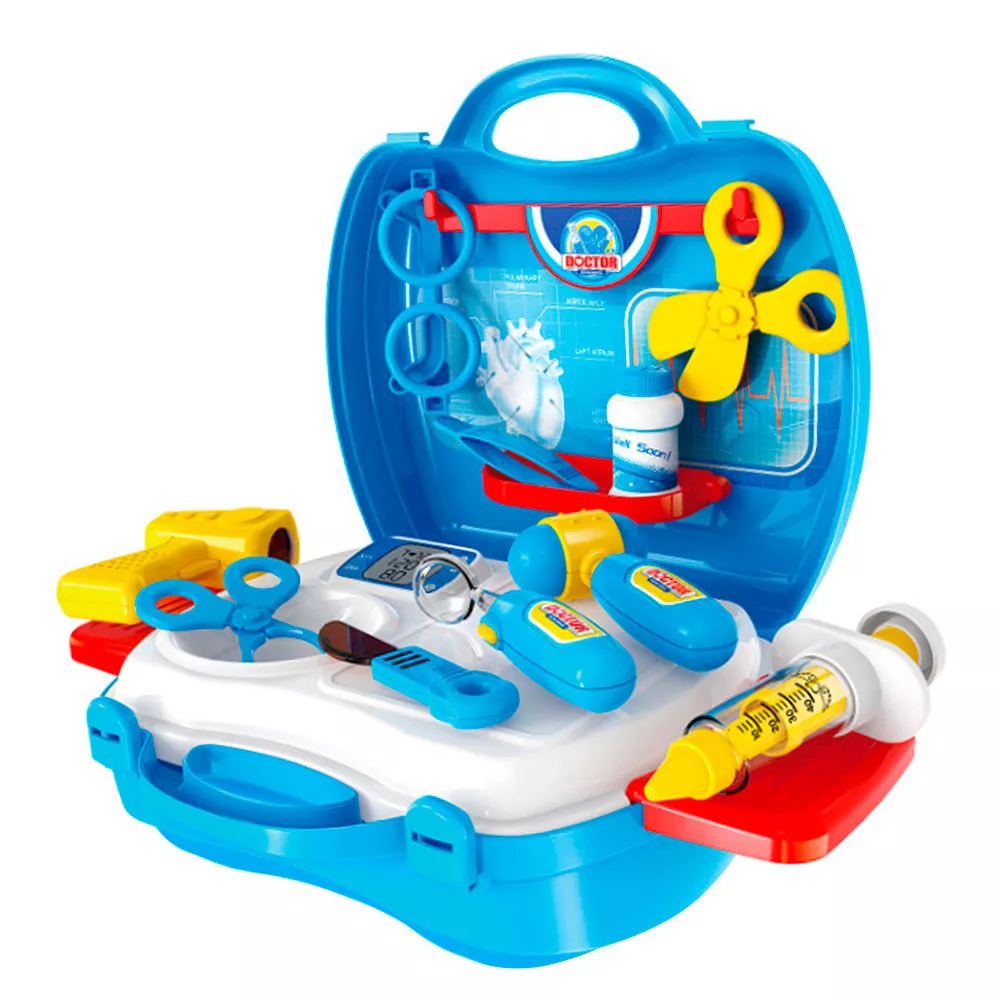 Играя в различные профессии, дети стараются подражать взрослым. С предлагаемым набором маленькие фантазеры смогут почувствовать себя настоящими докторами. Этот игровой комплект состоит из небольшого чемоданчика, в котором находятся самые необходимые медицинские инструменты. К услугам маленьких врачей ножницы, шприц, электронный термометр и другие аксессуары. Всего в наборе 18 предметов. С таким комплектом кроха сможет играть в хирурга, лора, педиатра или невропатолога и «лечить» своих друзей или любимых кукол.