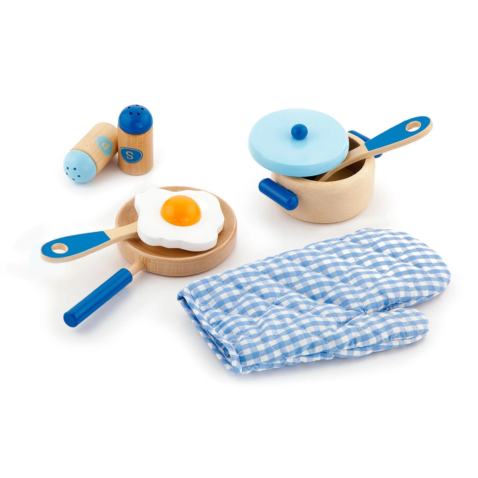 Кухонный набор голубого цвета включает кастрюлю, сковородку с яйцом, кухонную лопатку, половник, прихватку и набор специй. Маленькие повара с удовольствием будут придумывать разные игры с набором.