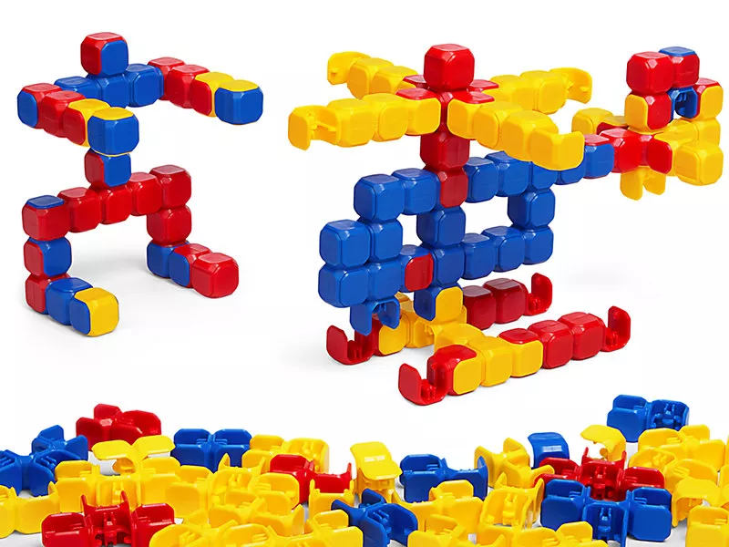 Набор состоит из множества пластиковых компонентов, которые можно соединять между собой, превращая в креативные конструкции. Детали разного цвета можно скомпоновать по цвету, а можно создать разноцветных роботов, построить замки, соорудить гараж для любимой машинки или же просто дать волю своей фантазии. Изделия крепятся друг к другу, формируя кубики, потому можно формировать совершенно любую фигуру. Чтобы начать игру достаточно соединить две детали между собой.