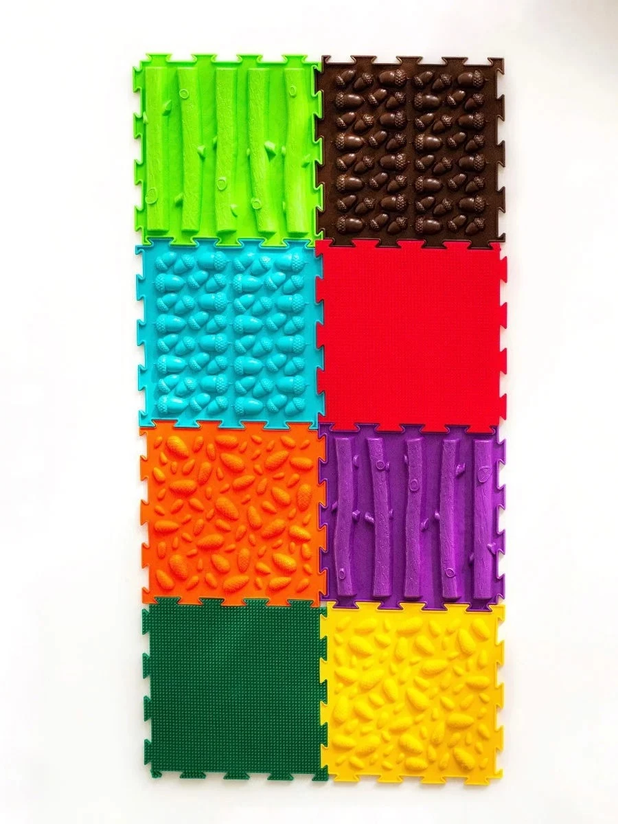 Набор модульных ковриков не только своим ярким и привлекающим дизайном украсит любое помещение, но и послужит хорошей профилактикой плоскостопия и благополучно повлияет на физическое развитие ребенка. Набор этих ковриков направлен больше в лечебных целях и имеет разную текстуру, с которой можно придумать как лечащую зарядку, так и развивающие игры.
