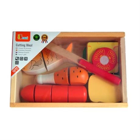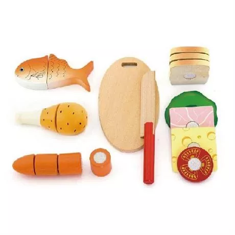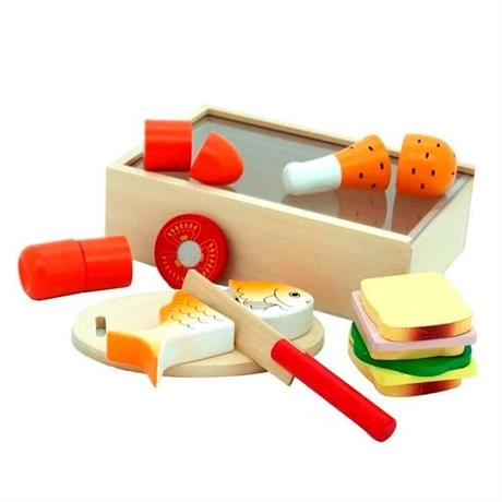 В наборе есть все, что нужно маленьким кулинарам для приготовления перекуса. Каждый продукт из набора можно разделить на несколько частей, которые можно соединить с помощью текстильной застежки. Набор сделан из высококачественной древесины и упакован в деревянную коробку с пластиковой крышкой.