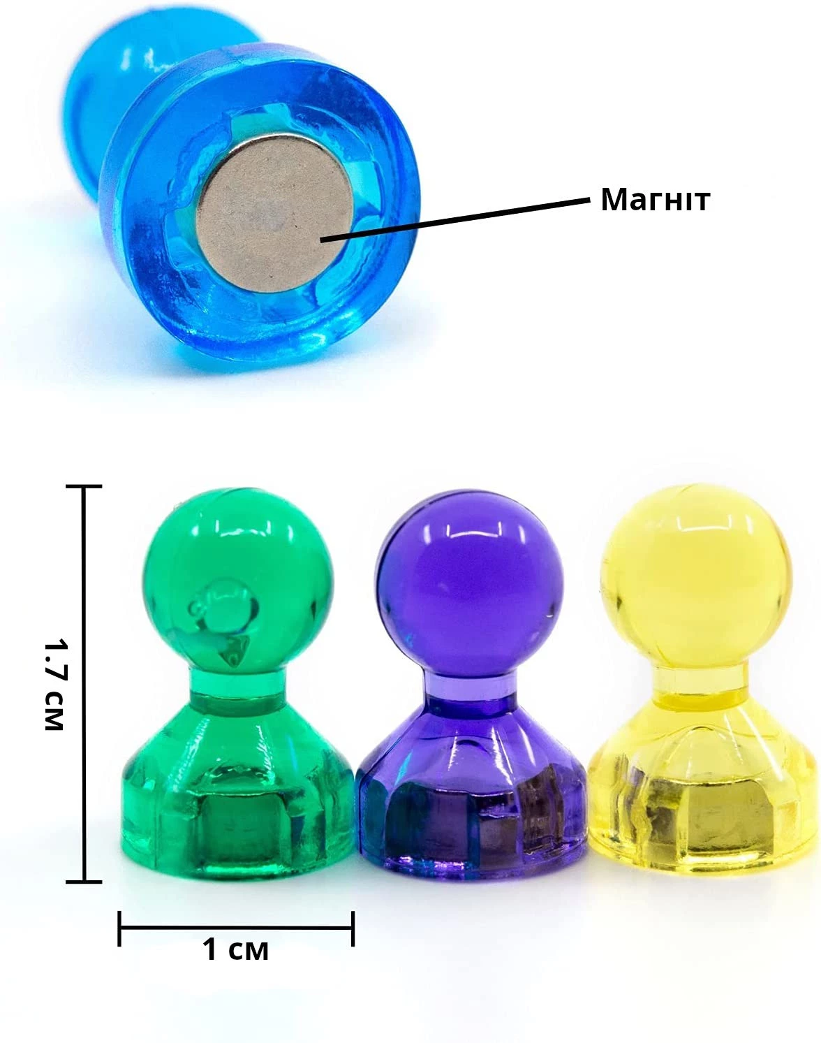 Каждый магнит, входящий в данный набор, обладает суперсилой и способен удерживать до 11 листов бумаги на любой металлической поверхности! Отныне вам не придется пользоваться классическими канцелярскими кнопками, рискуя случайно уколоться или испортить стенку. Вместо них можно использовать эти магнитные фишки. Набор таких магнитов пригодится дома, в офисе, в учебном заведении. Идеально подходит для хранения листов бумаги, фотографий, заметок, открыток. Сделайте свой кабинет или классную комнату красивыми и яркими.