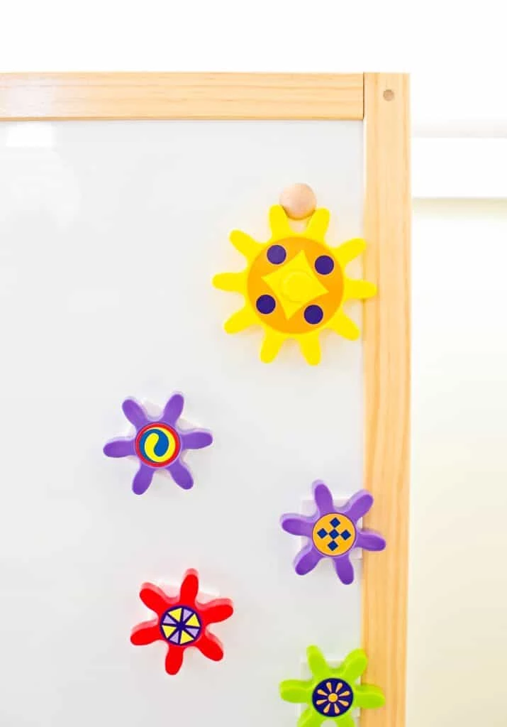 Красочный строительный набор магнитных шестеренок позволяет детям создать захватывающее вращающиеся картинки и надписи! Взаимозаменяемые детали легко соединяются друг с другом. Дети просто крепят шестерни на магнитную поверхность, складывая из них узоры, буквы или лабиринты для скатывающегося шарика. Затем поворачивают одну из встроенных ручек, чтобы привести в движение все красочное шестеренки!