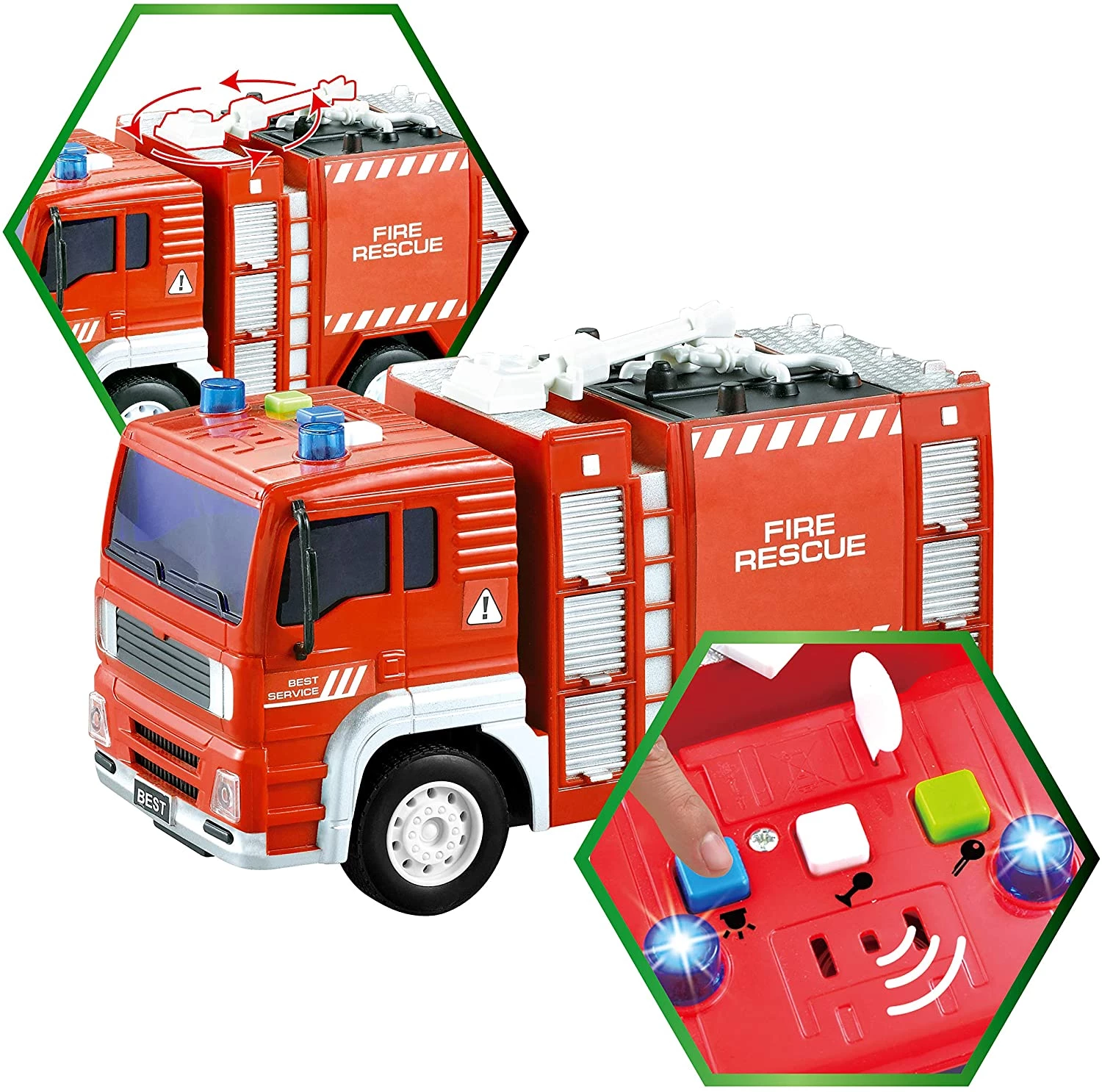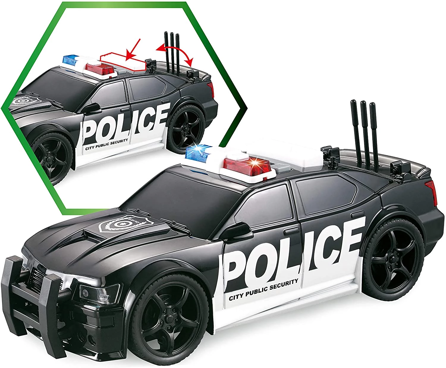 У всех мигают огоньки и есть звуковые сигналы. Пожарная машина имеет гибкий водяной насос, который можно вращать. Задняя антенна полицейской машины может качаться, делая вид, что показывает знак поимки преступника.