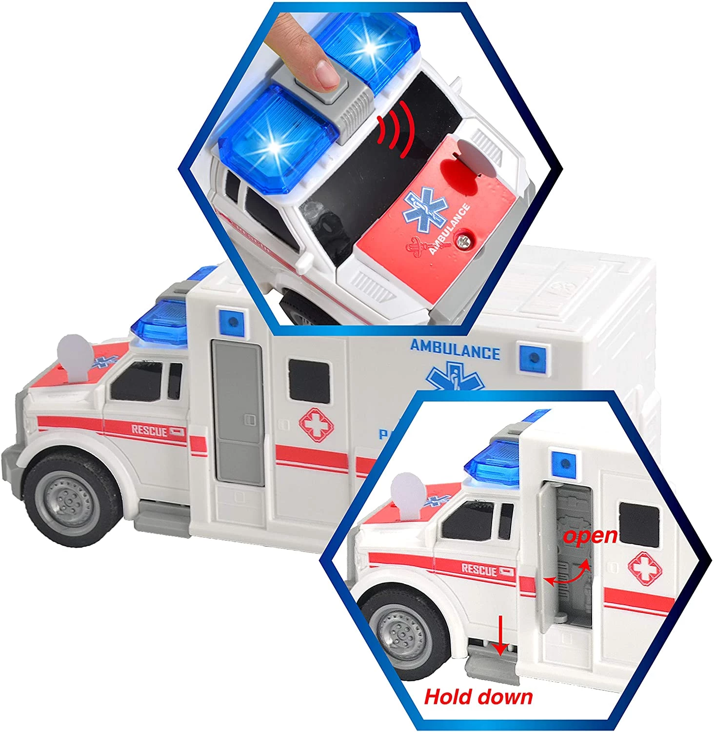 У машины скорой помощи есть открытая дверь, чтобы сделать вид, что она ухаживает за ранеными. Спасательный вертолет имеет вращающийся воздушный винт. Подъемный трос вертолета позволяет поднимать носилки, делая вид, что перевозит раненых.