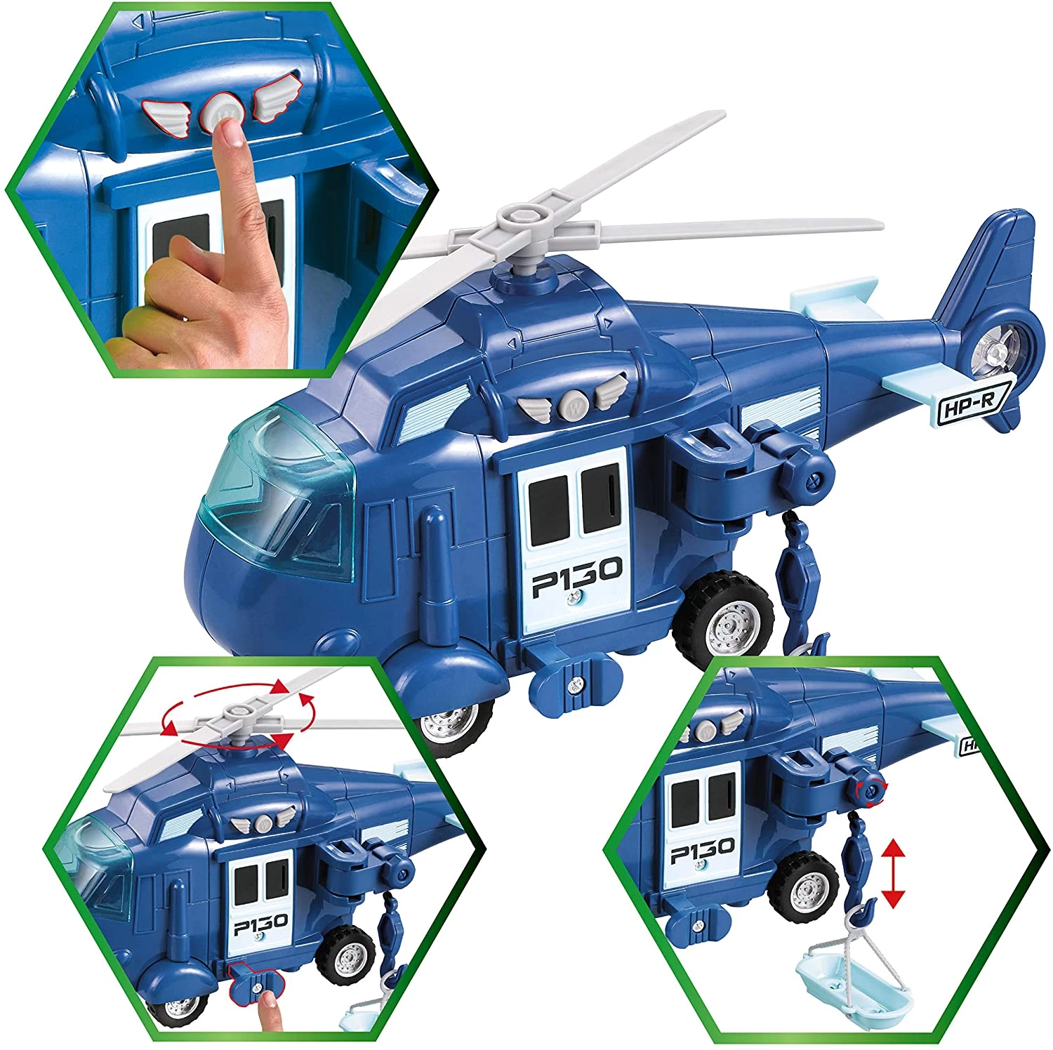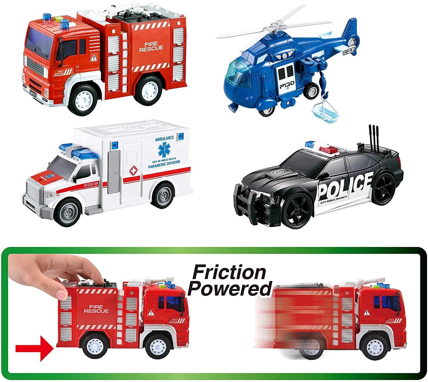 Набор в котором есть 4 машинки с разными функциями. Все машинки инерционные, издают разные звуки с мигающими фарами и огоньками. Скорая помощь, пожарная машина, спасательный вертолет и полицейская машина увлекут вашего ребенка на долгое время. Хорошо развивает физические и умственные способности. Позвольте вашему ребенку разыграть свою фантазию и придумать настоящий боевик с этими машинками, которые так схожи с настоящими.